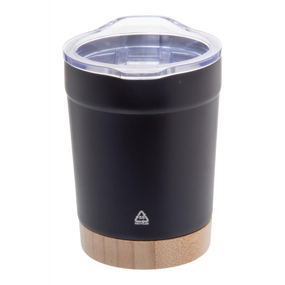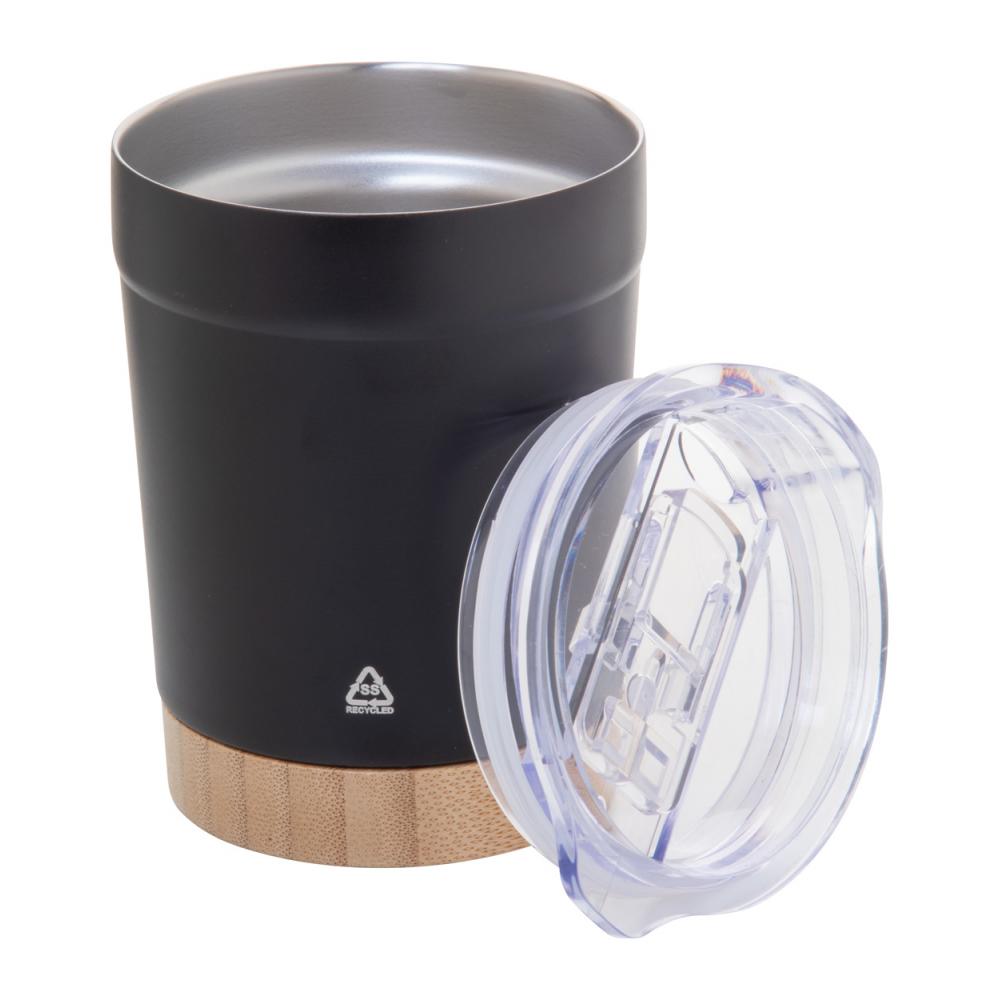 Двухстенный, изготовленный из переработанной нержавеющей стали, вакуумно изолированный термокружка с бамбуковым основанием и пластиковой крышкой для питья. Объем - 300 мл.
