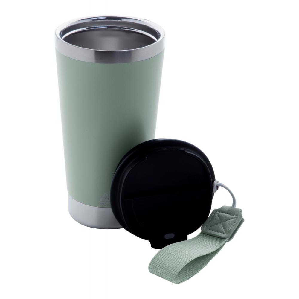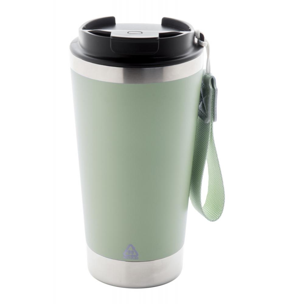 Двухстенный термокружка из переработанной нержавеющей стали с изоляцией, с крышкой для питья из ПП и сопровождающим цветом ремешком для переноски. 430 мл.