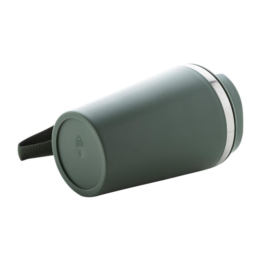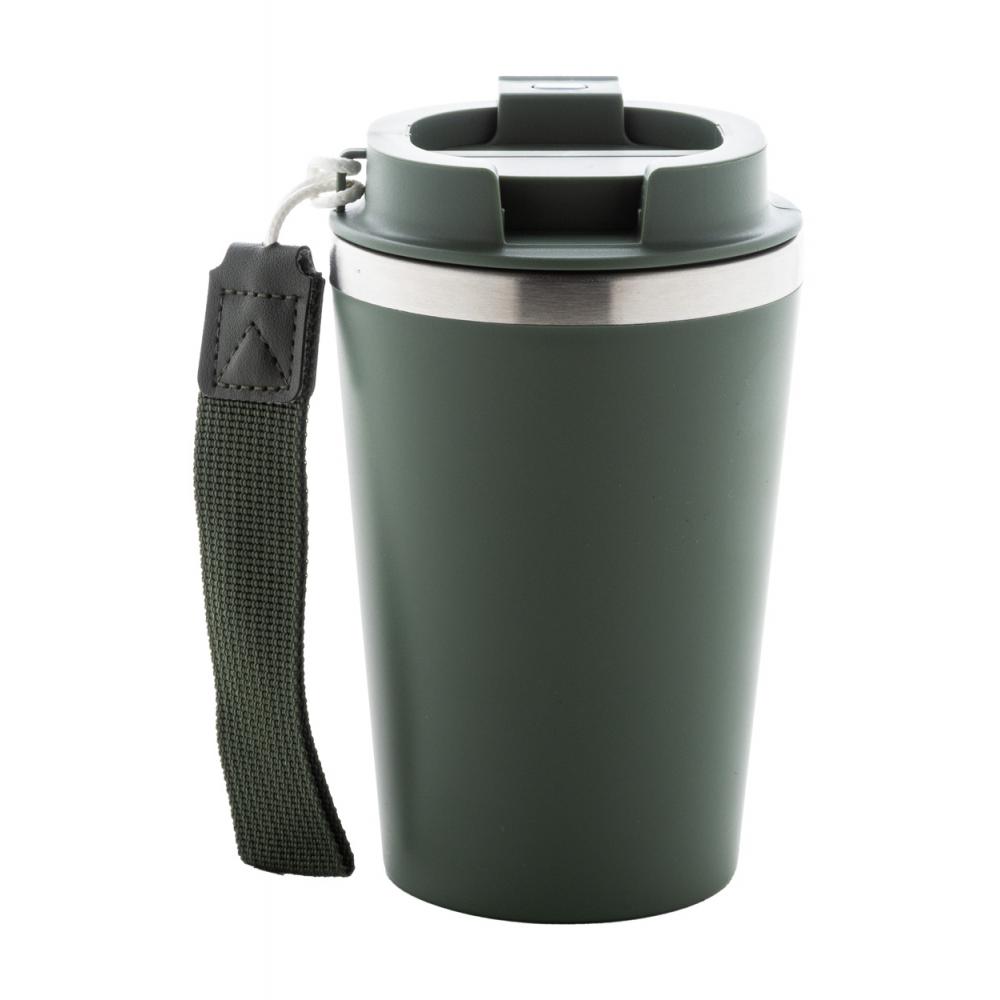 Двойная стенка, изготовленная из переработанной нержавеющей стали, изолированный термокружок с наружным слоем из пластика PP и крышкой для питья. С ремешком для переноски из RPET. 350 мл.