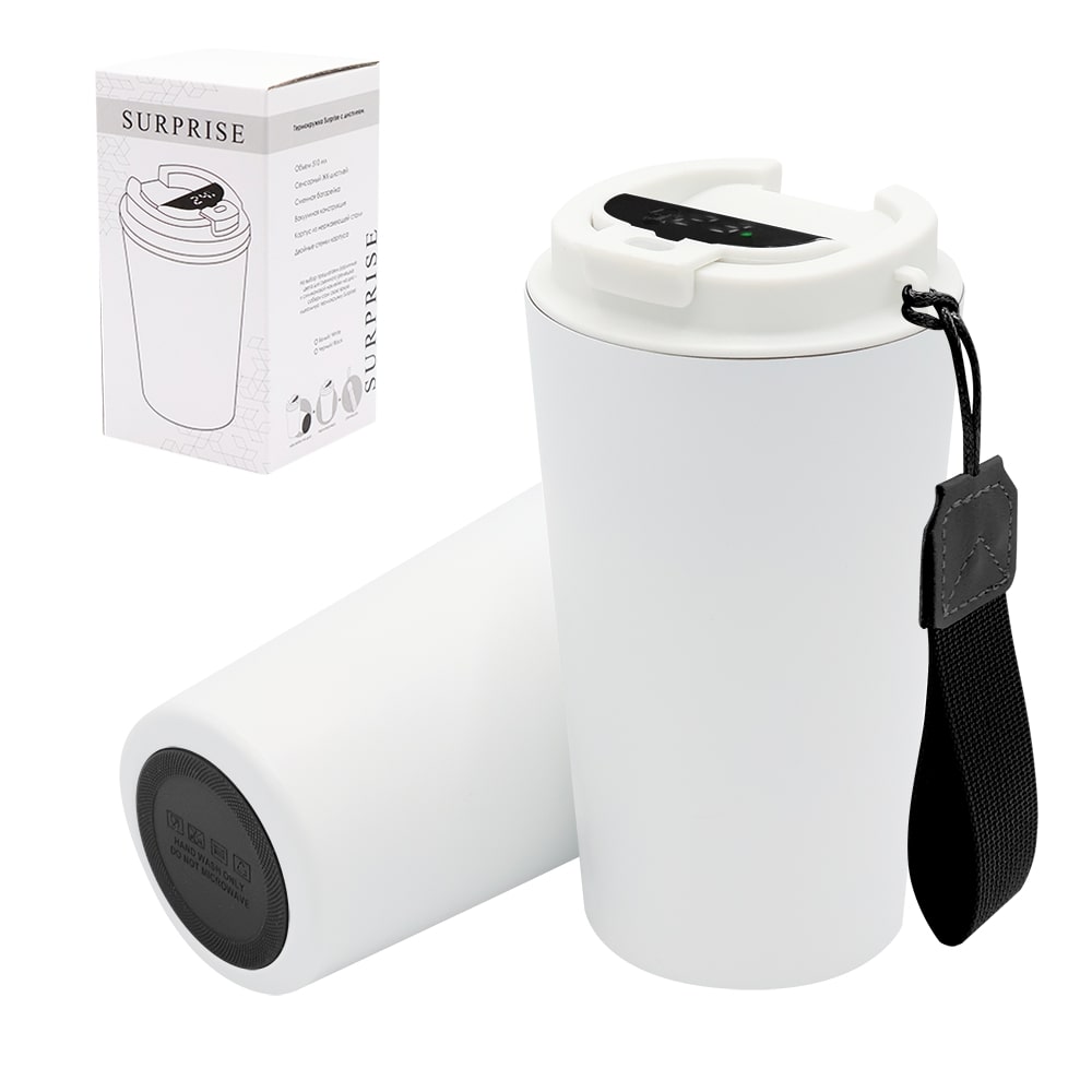 Термокружка Surprise To Go с дисплеем выполнена из пищевой нержавеющей стали. Имеет двойные стенки с вакуумной изоляцией, а крышка изготовлена из пищевого безопасного для человека пластика. Термокружка Surprise To Go не только сохраняет ваши напитки горячими, но и показывает температуру напитка! Уникальная особенность данной термокружки – наличие сенсорного индикатора температуры, расположенного в крышке. Чтобы узнать температуру напитка внутри кружки, достаточно прикоснуться к поверхности крышки. Работает от 1 батарейки типа CR2032 (в комплекте), которую в последующем можно самостоятельно заменить.