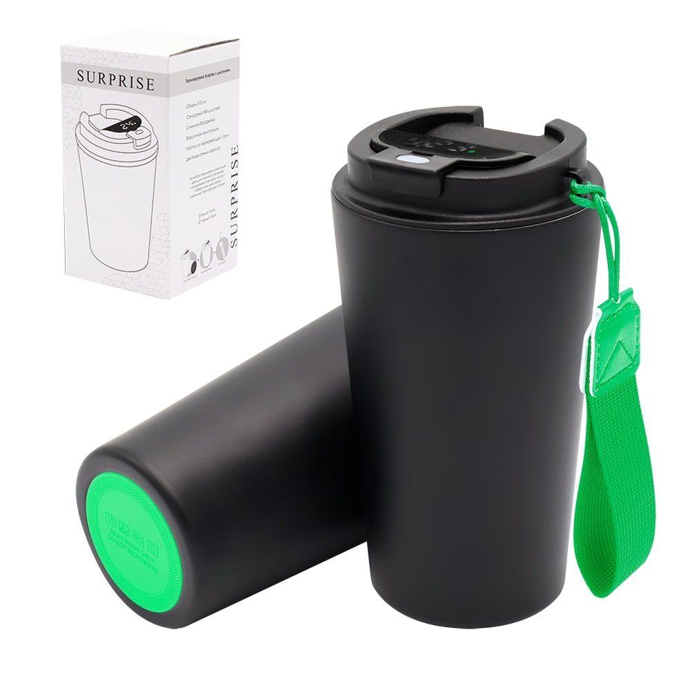Термокружка Surprise To Go с дисплеем выполнена из пищевой нержавеющей стали. Имеет двойные стенки с вакуумной изоляцией, а крышка изготовлена из пищевого безопасного для человека пластика. Термокружка Surprise To Go не только сохраняет ваши напитки горячими, но и показывает температуру напитка! Уникальная особенность данной термокружки – наличие сенсорного индикатора температуры, расположенного в крышке. Чтобы узнать температуру напитка внутри кружки, достаточно прикоснуться к поверхности крышки. Работает от 1 батарейки типа CR2032 (в комплекте), которую в последующем можно самостоятельно заменить.