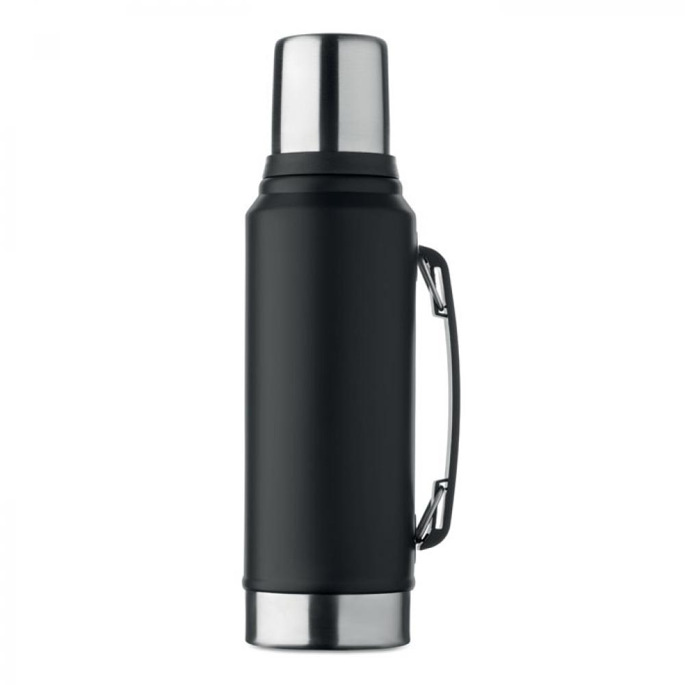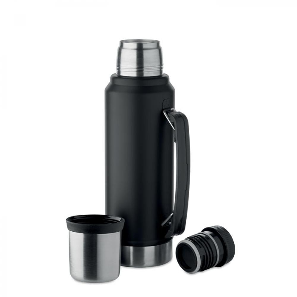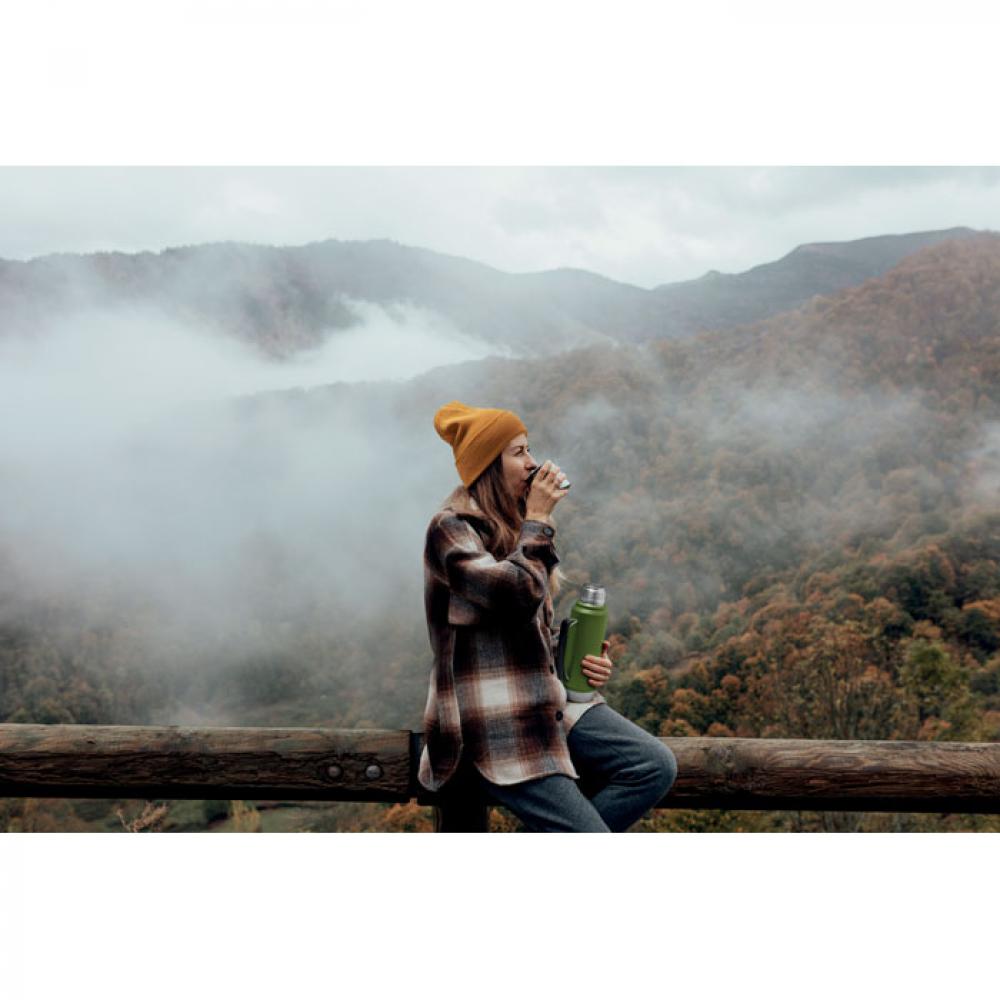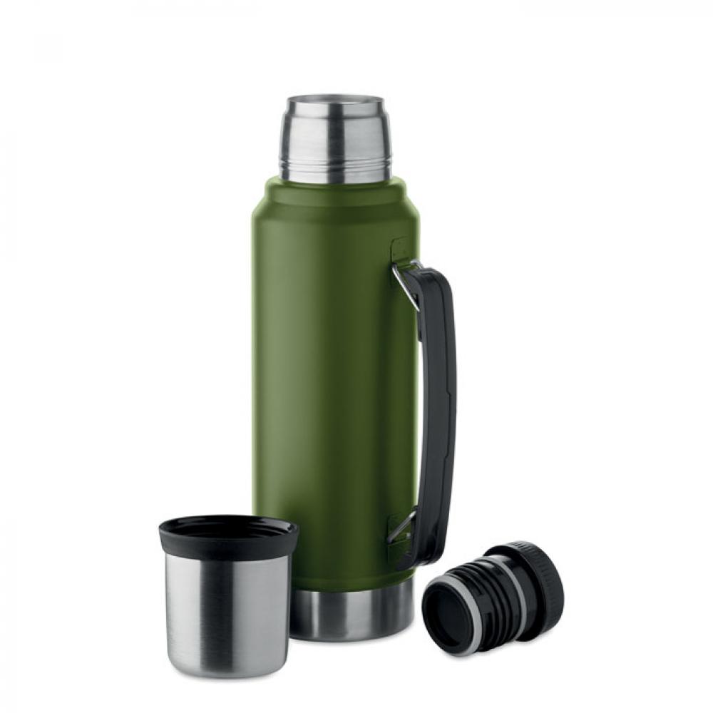 Термос с двойными стенками из переработанной нержавеющей стали 90% и 10% нержавеющей стали с боковой ручкой, крышкой из полипропилена и чашкой из переработанной нержавеющей стали. Герметичный. Емкость: 1 л.