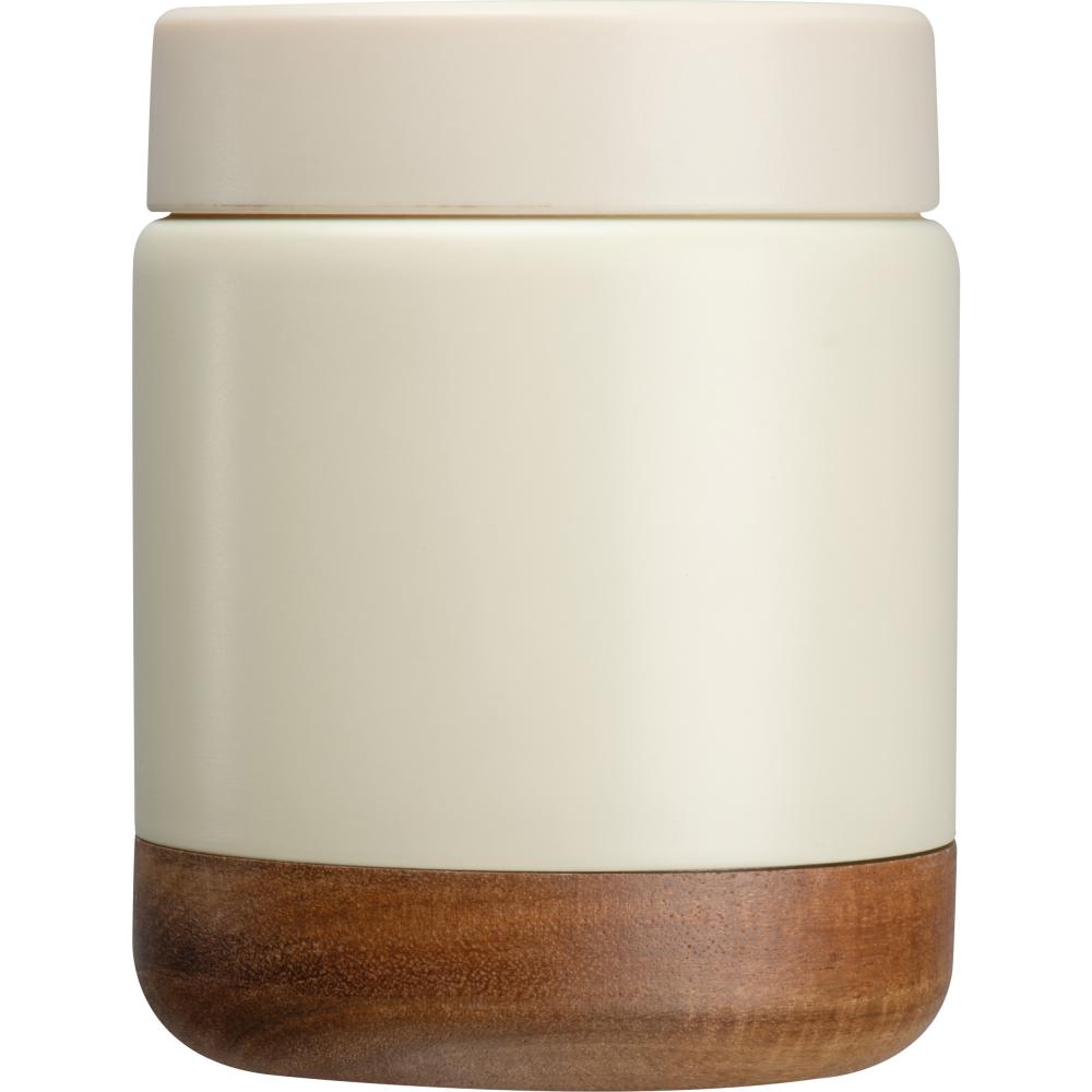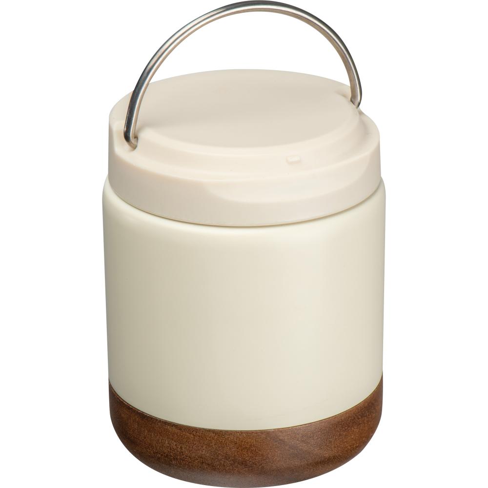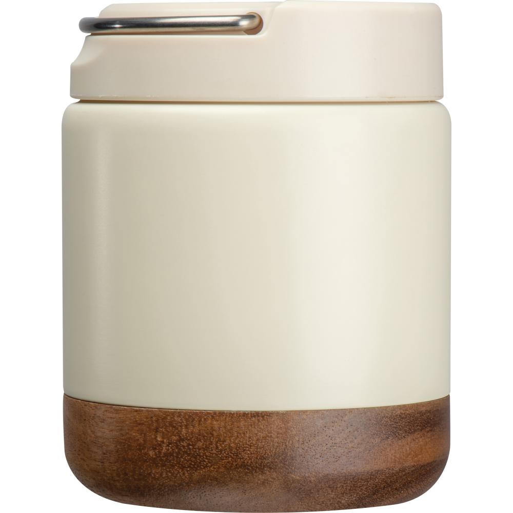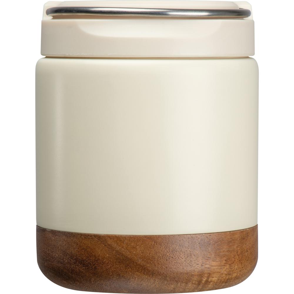 Двухслойная термос-коробка из переработанной нержавеющей стали. Она имеет винтовую крышку с деревянной ручкой из акации и удобную ручку для переноски. Вместимость 400 мл.