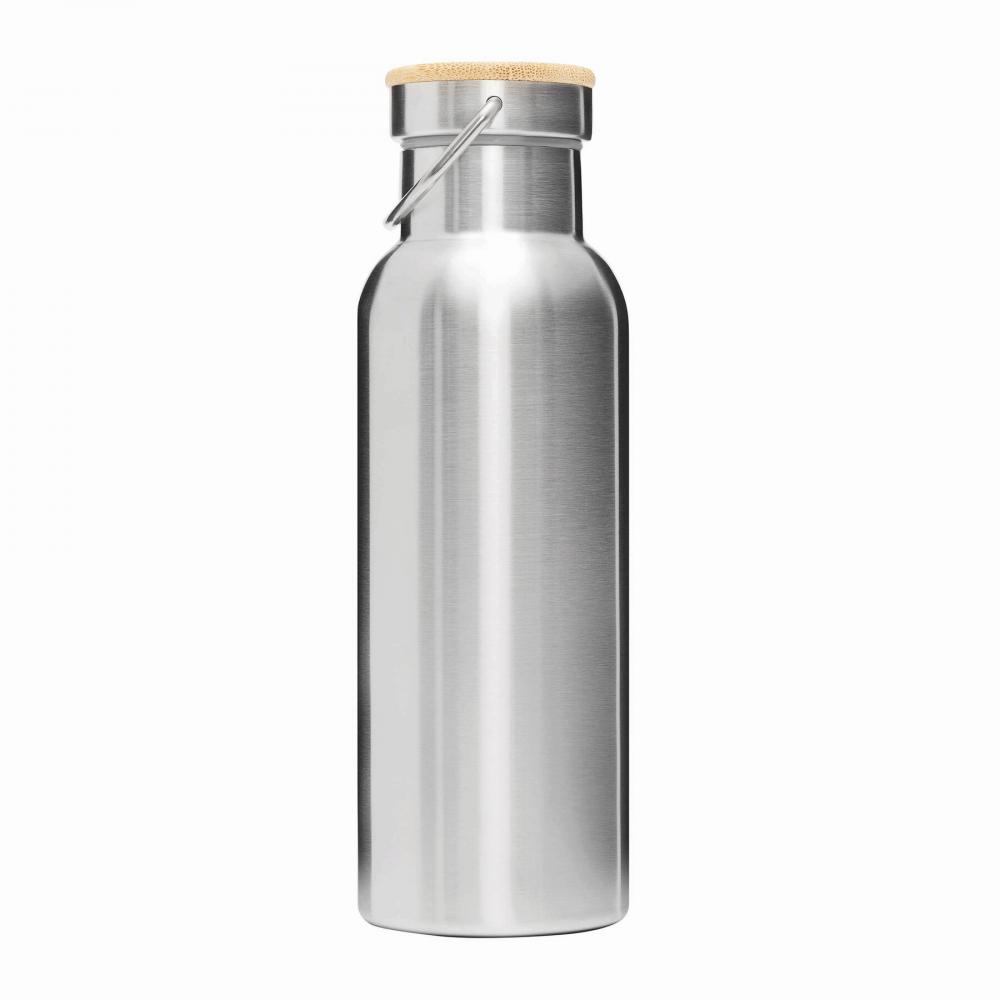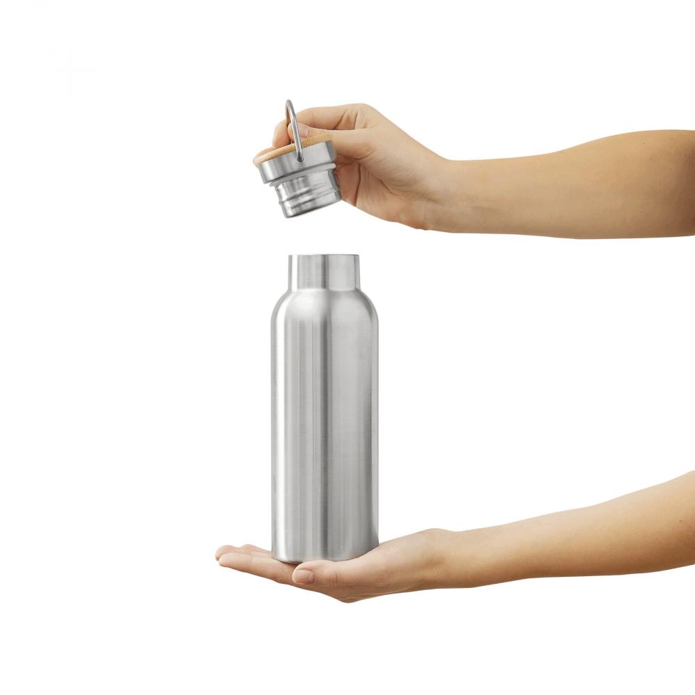 Термос для напитков ECO FLAVOUR с двойными стенками: изнутри и снаружи из нержавеющей стали, надежная винтовая крышка из бамбука с силиконовым уплотнителем и петлей для переноски, вместимость около 500 мл, сохраняет тепло до 8 часов и холод до 12 часов.