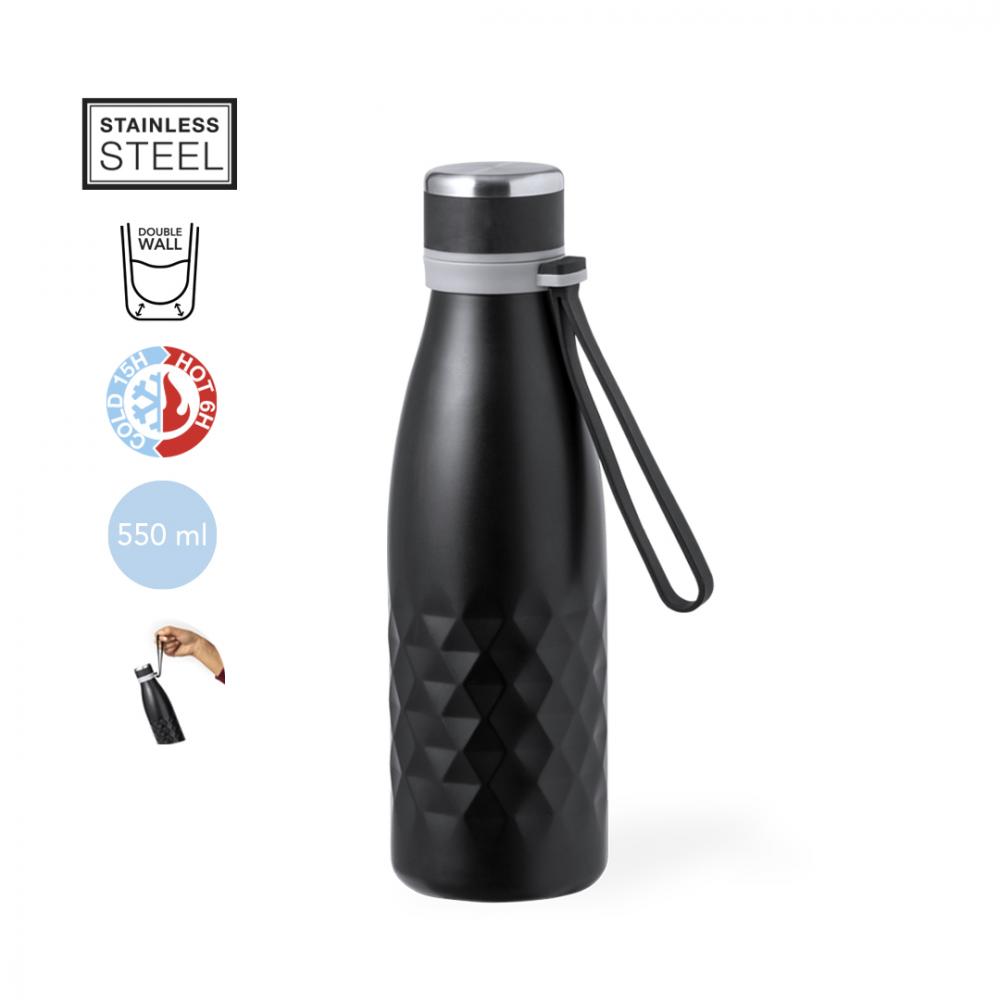 Стильная термос-бутылка на 550 мл, изготовленная из нержавеющей стали с двойной стенкой, с винтовой крышкой для оптимального герметичного закрытия. Имеет удобную ручку из мягкого силикона. Доступна в широкой цветовой гамме металлических оттенков, с элегантным алмазным узором по всему корпусу. Поставляется в индивидуальной коробке из крафт-картона. 550 мл