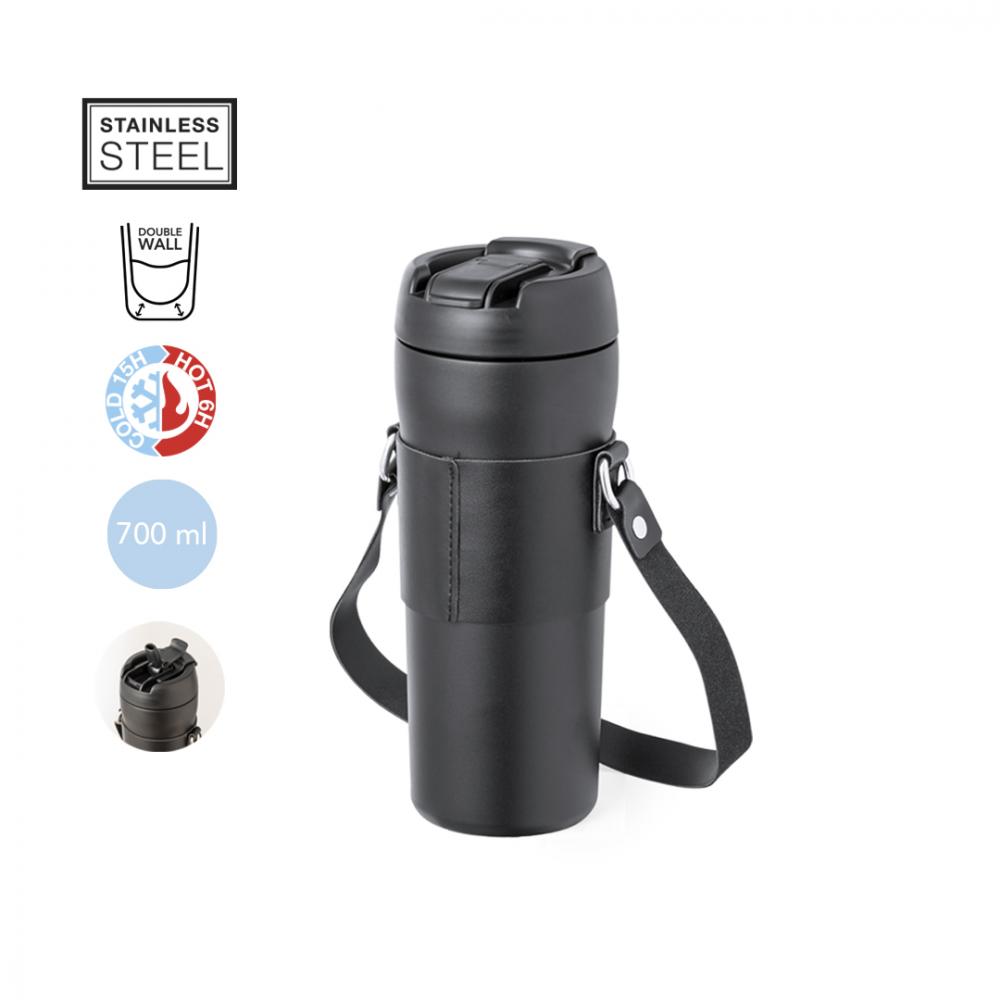 Характеристики Стильный термос объемом 700 мл, изготовленная из нержавеющей стали с двойной стенкой. Уникальная крышка-винт с дозатором в крышке и соплом для соломки. С ручкой для переноски и подходящей обивкой из искусственной кожи. Представлена в индивидуальной коробке дизайна "крафт". 700 мл