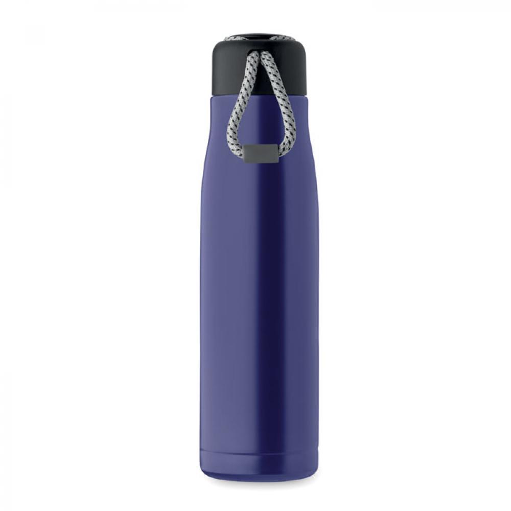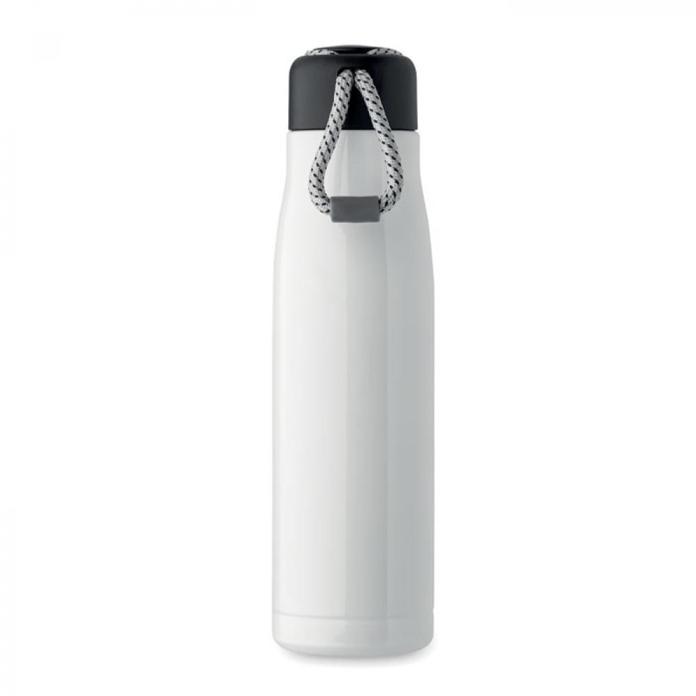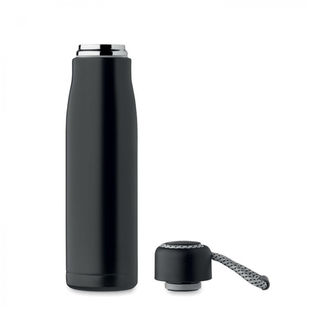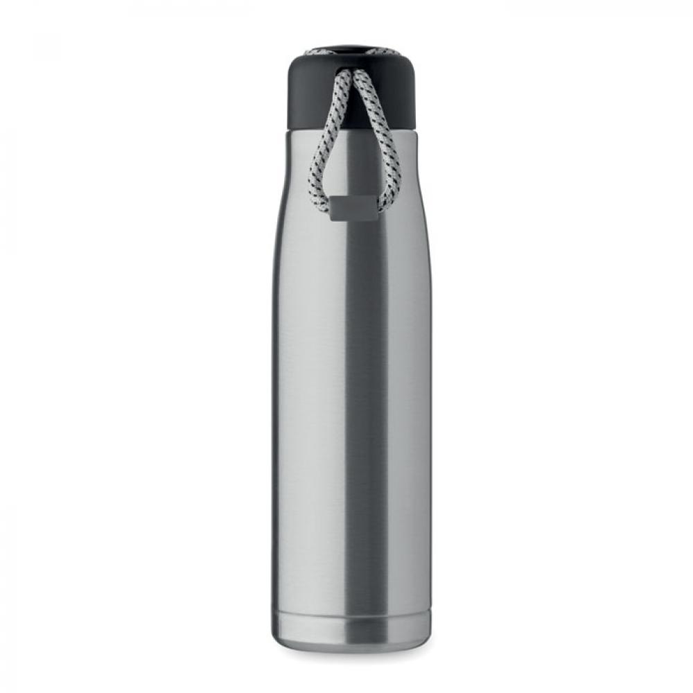 Термос с двойными стенками из 90% переработанной нержавеющей стали и 10% нержавеющей стали со шнурком-держателем на крышке из полипропилена. Герметичен. Объем: 500 мл.
