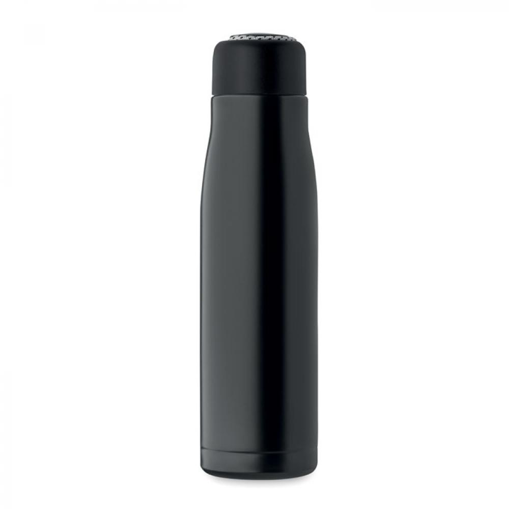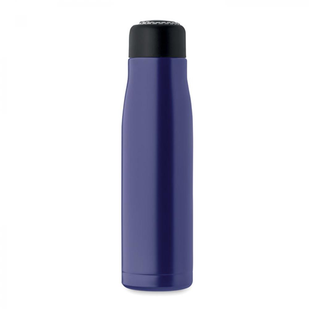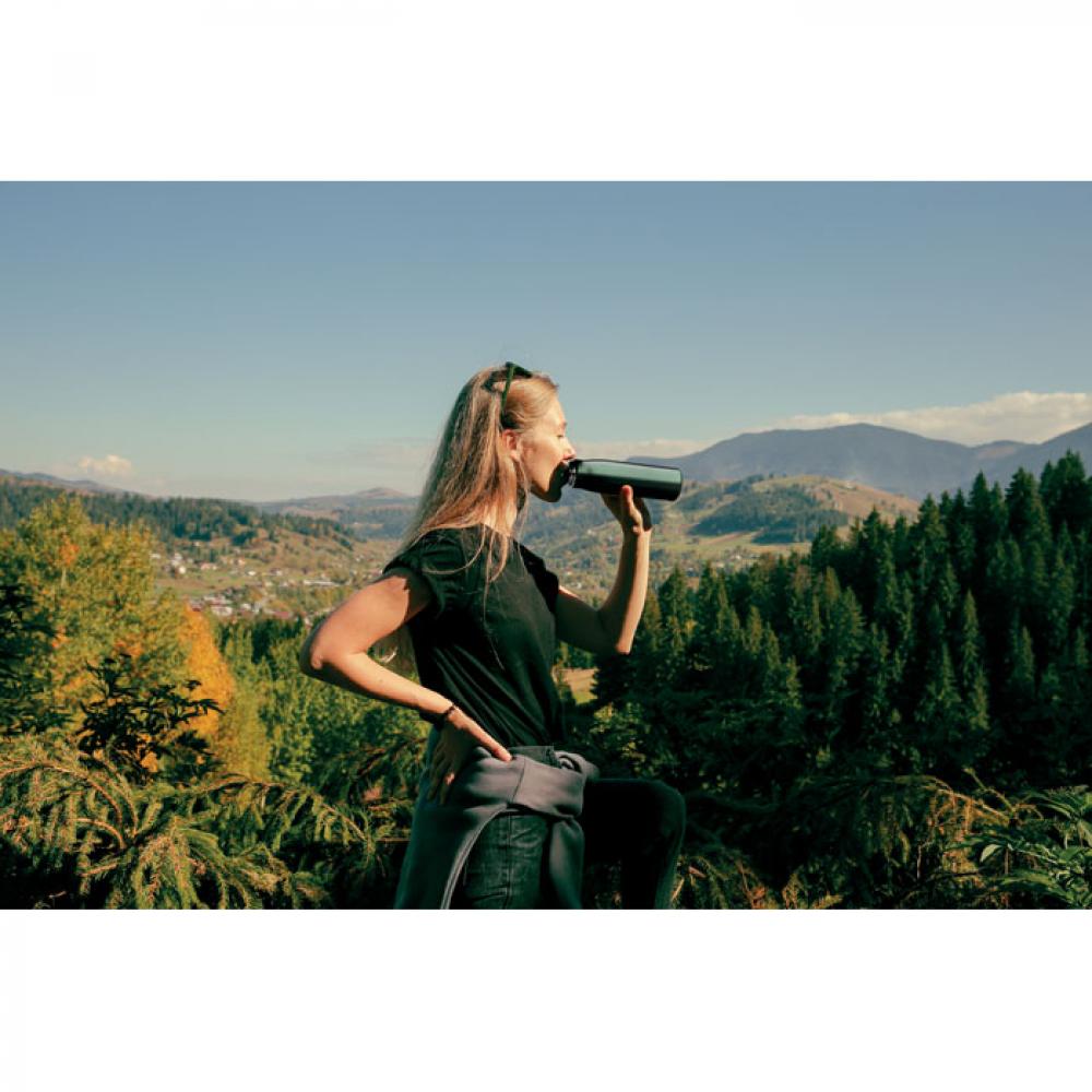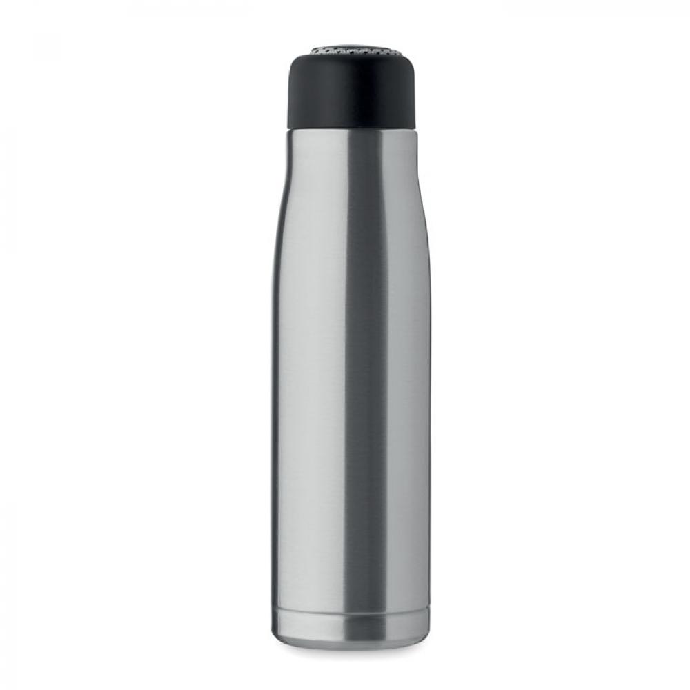Термос с двойными стенками из 90% переработанной нержавеющей стали и 10% нержавеющей стали со шнурком-держателем на крышке из полипропилена. Герметичен. Объем: 500 мл.