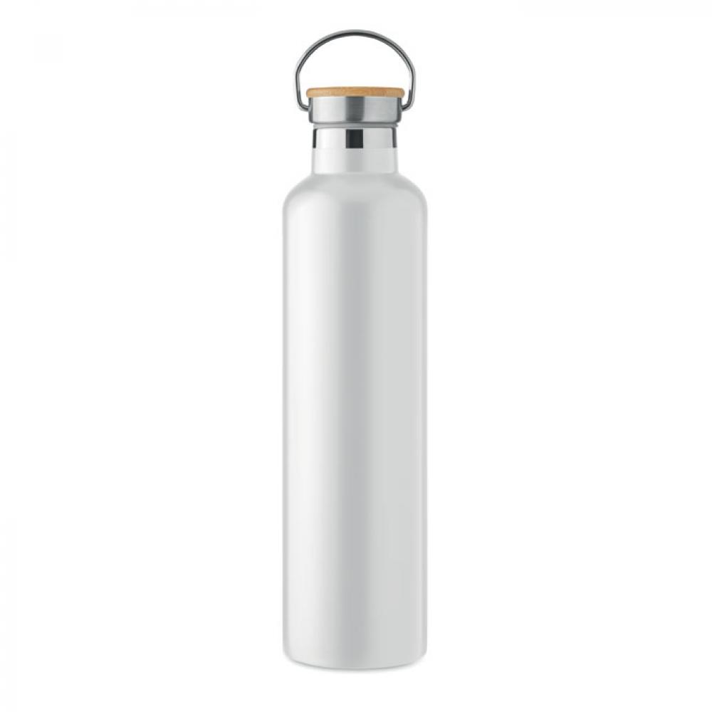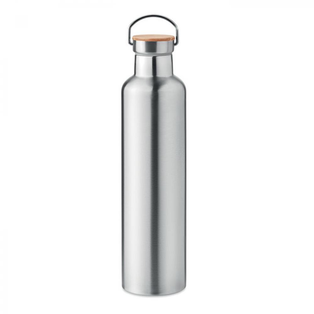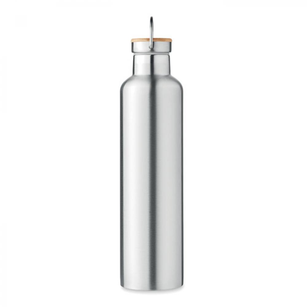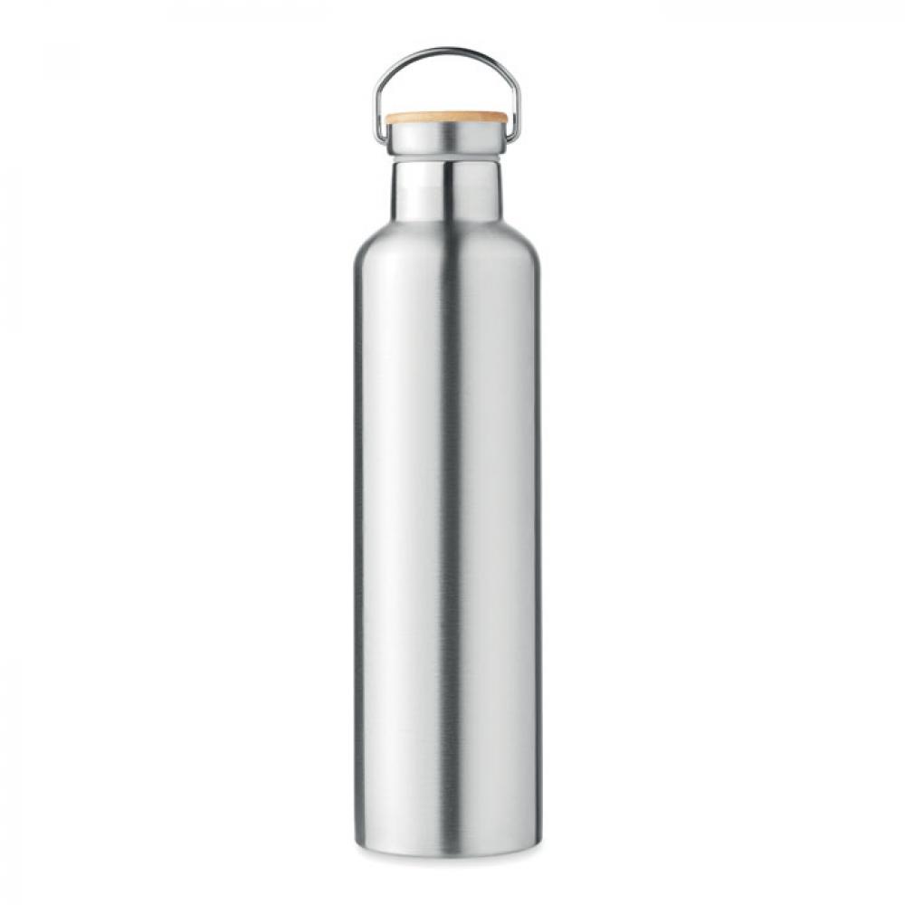 Термос с вакуумной колбой из нержавеющей стали с двойными стенками, бамбуковой крышкой и ручкой для переноски. Объем: 1 л.