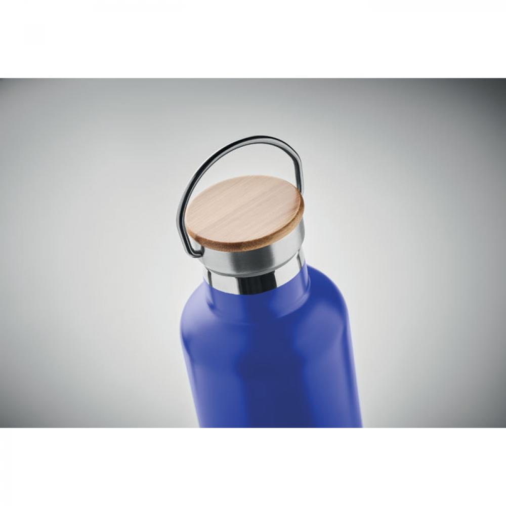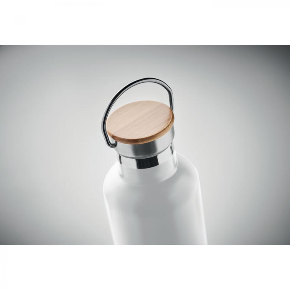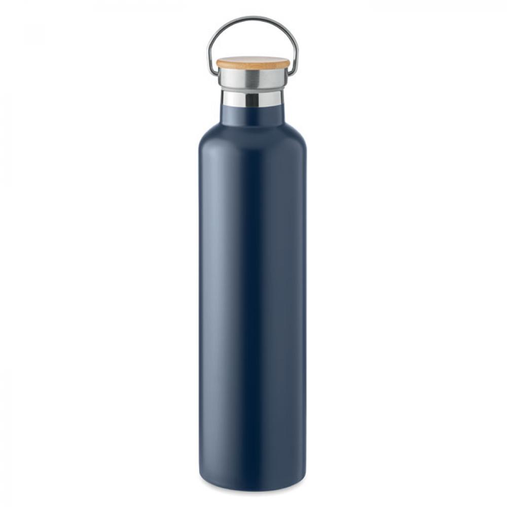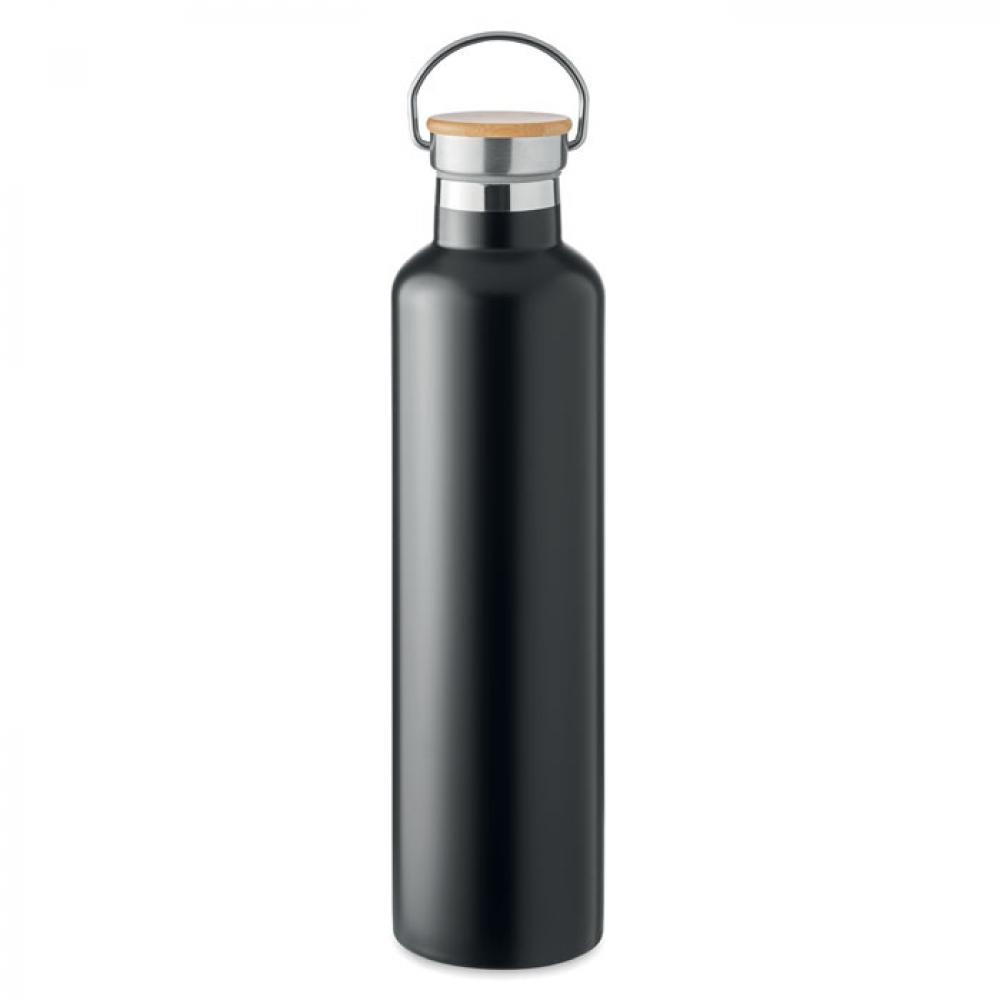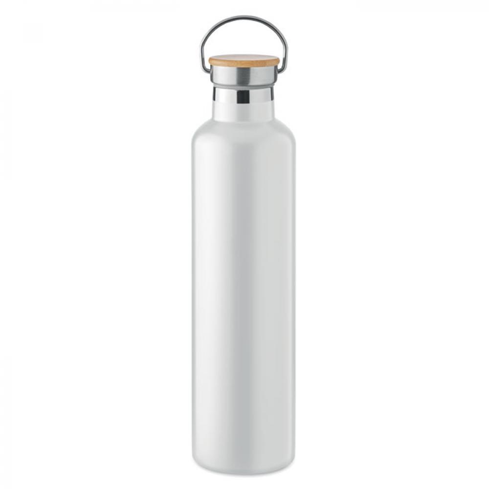 Термос с вакуумной колбой из нержавеющей стали с двойными стенками, бамбуковой крышкой и ручкой для переноски. Объем: 1 л.