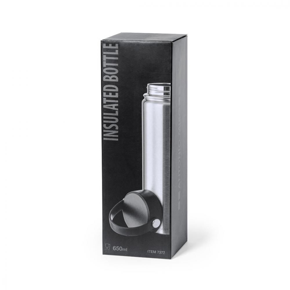 Термоc Antonio Miró емкостью 650 мл. Изготовлен из нержавеющей стали с двойными стенками и сатинированной отделкой. С черной завинчивающейся крышкой и силиконовым ремешком для переноски. С логотипом бренда и доствляется в индивидуальной черной коробке с логотипом Antonio Miró.