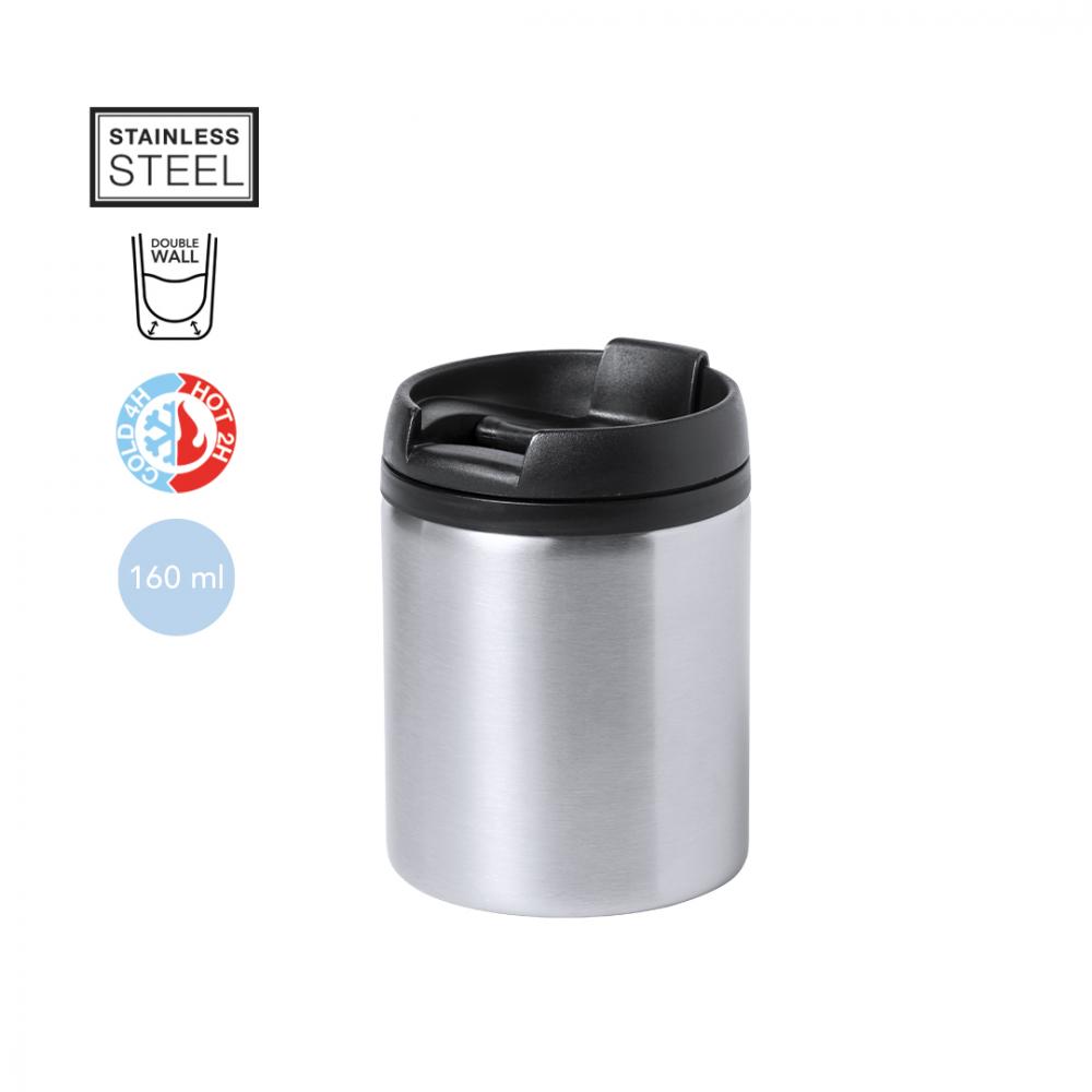 Термостакан из нержавеющей стали емкостью 160 мл. Включает крышку с дозатором и доступна в широкой гамме металлических цветов. Представлен в привлекательной дизайнерской коробке. 160 мл