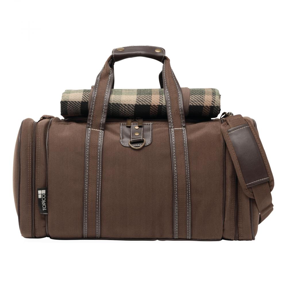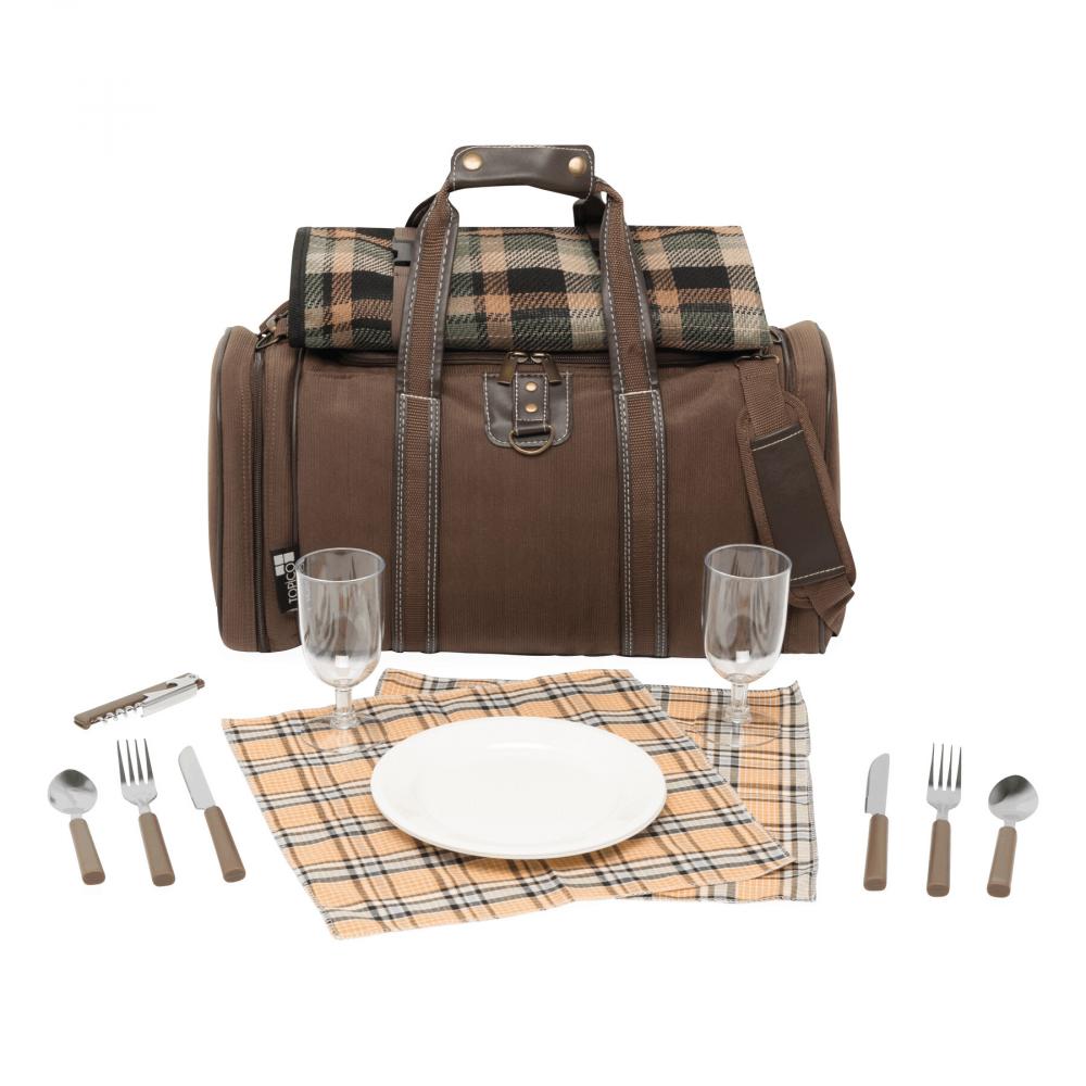 Термосумка для пикника 4 PICKNICK на 4 человека: боковые карманы на молнии, заполненные 4 пластиковыми тарелками, стаканами, металлическими ложками, вилками, ножами и салфетками, нож официанта, изолированный карман-холодильник на молнии для напитков и еды, вкл. пикниковый плед (135 x 113 см) с устойчивой к пятнам нижней стороной, регулируемые и съемные плечевые ремни, 2 ручки для переноски