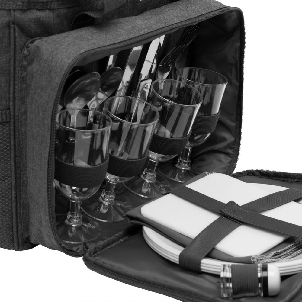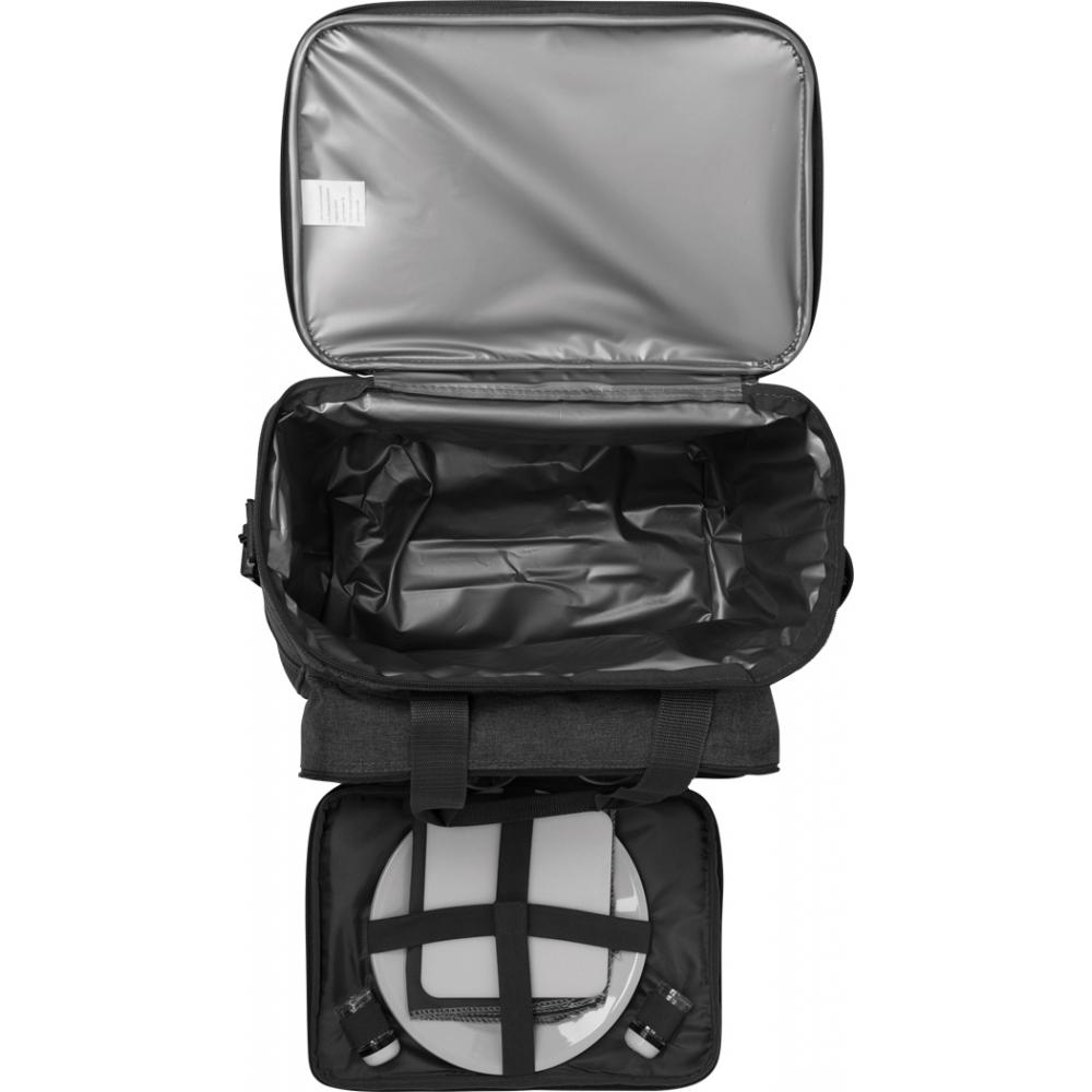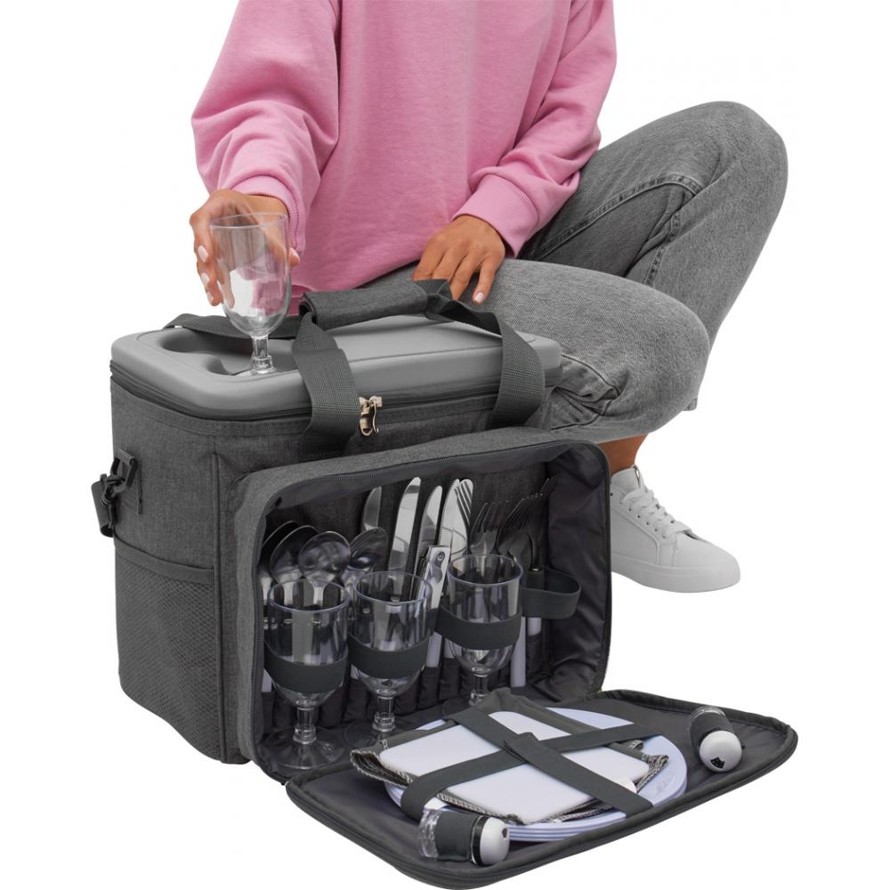 Термосумка для пикника SIDE TRIP на 4 человека, с утепленным основным карманом на молнии, крышка может служить мини-столиком с подстаканником, в переднем кармане на молнии находится пластиковая посуда и пластиковые бокалы для вина, нож официанта, тканевые салфетки, набор солонок и перечниц и разделочная доска, 2 сетчатых кармана на по бокам регулируемые и съемные плечевые ремни, 2 ручки для переноски.