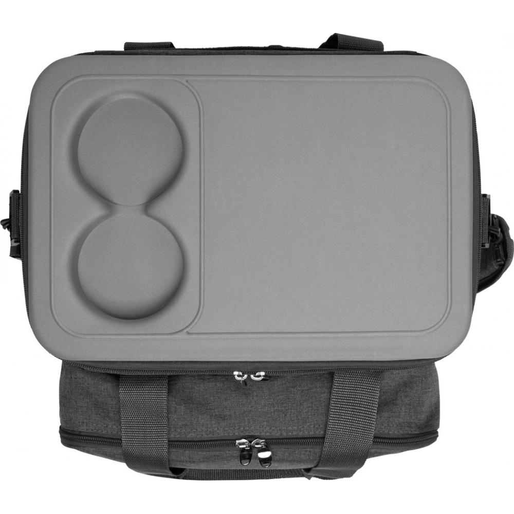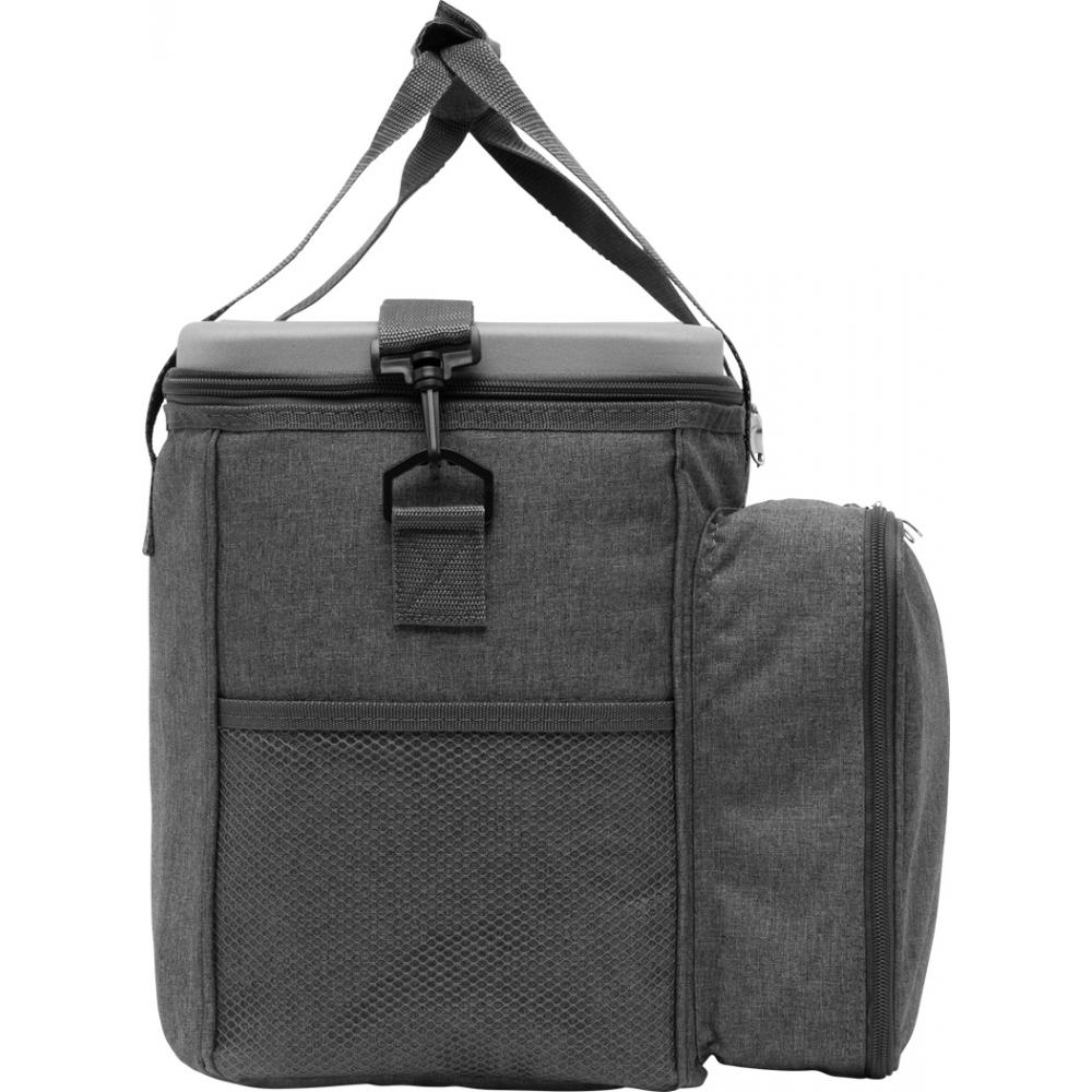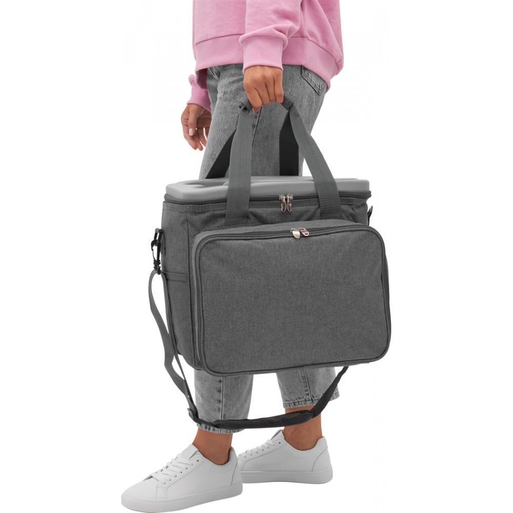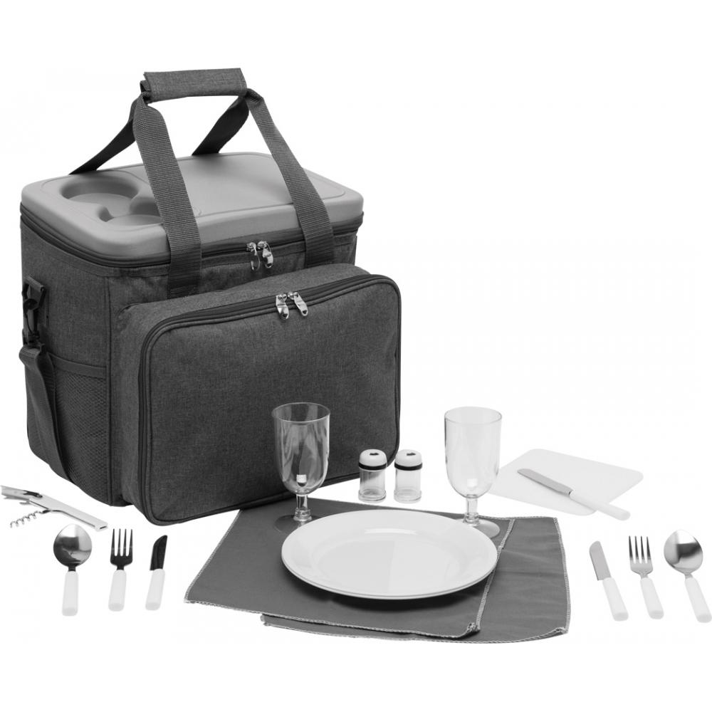 Термосумка для пикника SIDE TRIP на 4 человека, с утепленным основным карманом на молнии, крышка может служить мини-столиком с подстаканником, в переднем кармане на молнии находится пластиковая посуда и пластиковые бокалы для вина, нож официанта, тканевые салфетки, набор солонок и перечниц и разделочная доска, 2 сетчатых кармана на по бокам регулируемые и съемные плечевые ремни, 2 ручки для переноски.