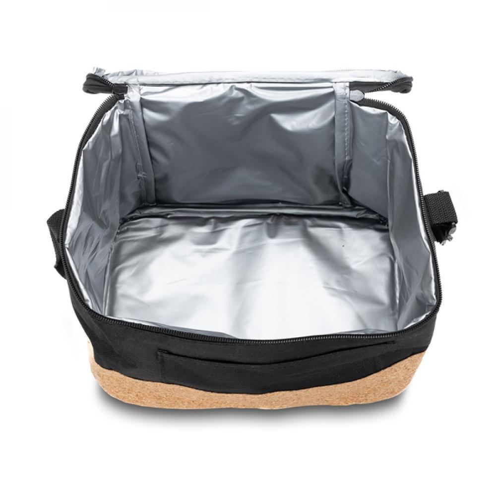 Сумка-холодильник для ланча с отделкой из пробки. Утеплен материалом PEVA, поддерживающим необходимую температуру еды и напитков. Идеально подходит для обеда в офисе, а также для путешествий, пляжа или пикника. Поставляется с регулируемым плечевым ремнем, боковым внешним карманом и застежкой-молнией.