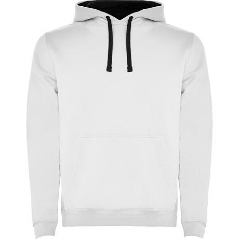 Однотонная или двухцветная толстовка с двухслойным капюшоном, регулируемым шнурком и карманом-кенгуру. Манжеты и нижний край выполнены из эластичной резинки 1x1.