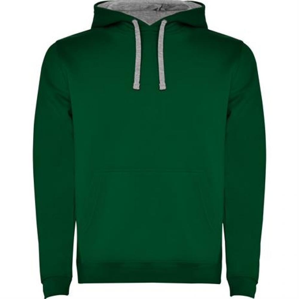 Однотонная или двухцветная толстовка с двухслойным капюшоном, регулируемым шнурком и карманом-кенгуру. Манжеты и нижний край выполнены из эластичной резинки 1x1.