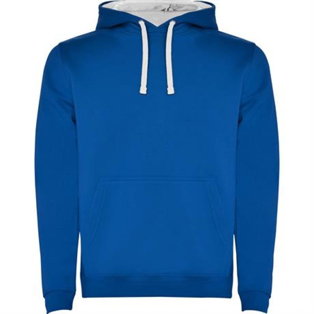 Однотонная или двухцветная толстовка с двухслойным капюшоном, регулируемым шнурком и карманом-кенгуру. Манжеты и нижний край выполнены из эластичной резинки 1x1.