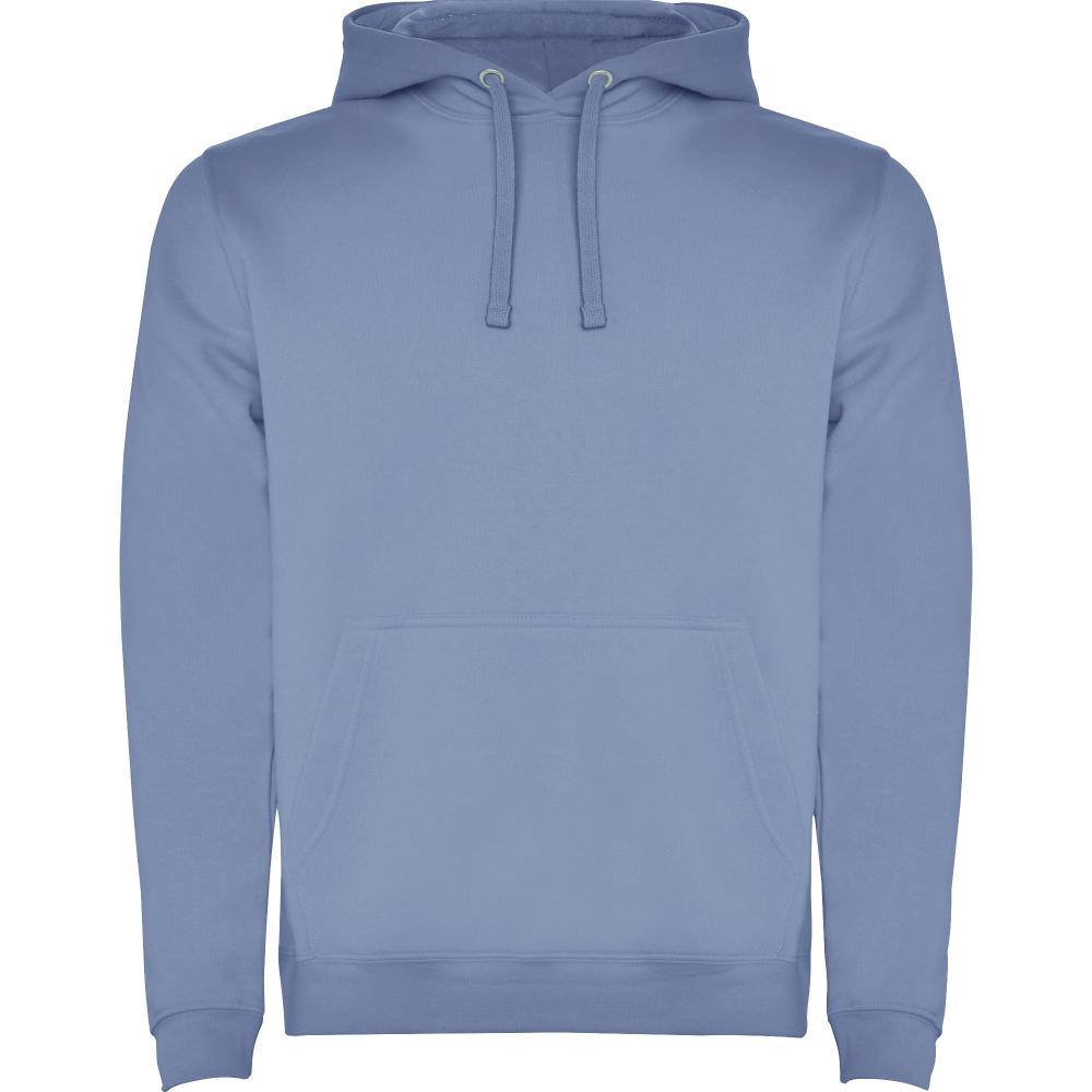 Однотонная или двухцветная толстовка с двухслойным капюшоном, регулируемым шнурком и карманом-кенгуру. Манжеты и нижний край выполнены из эластичной резинки 1x1.