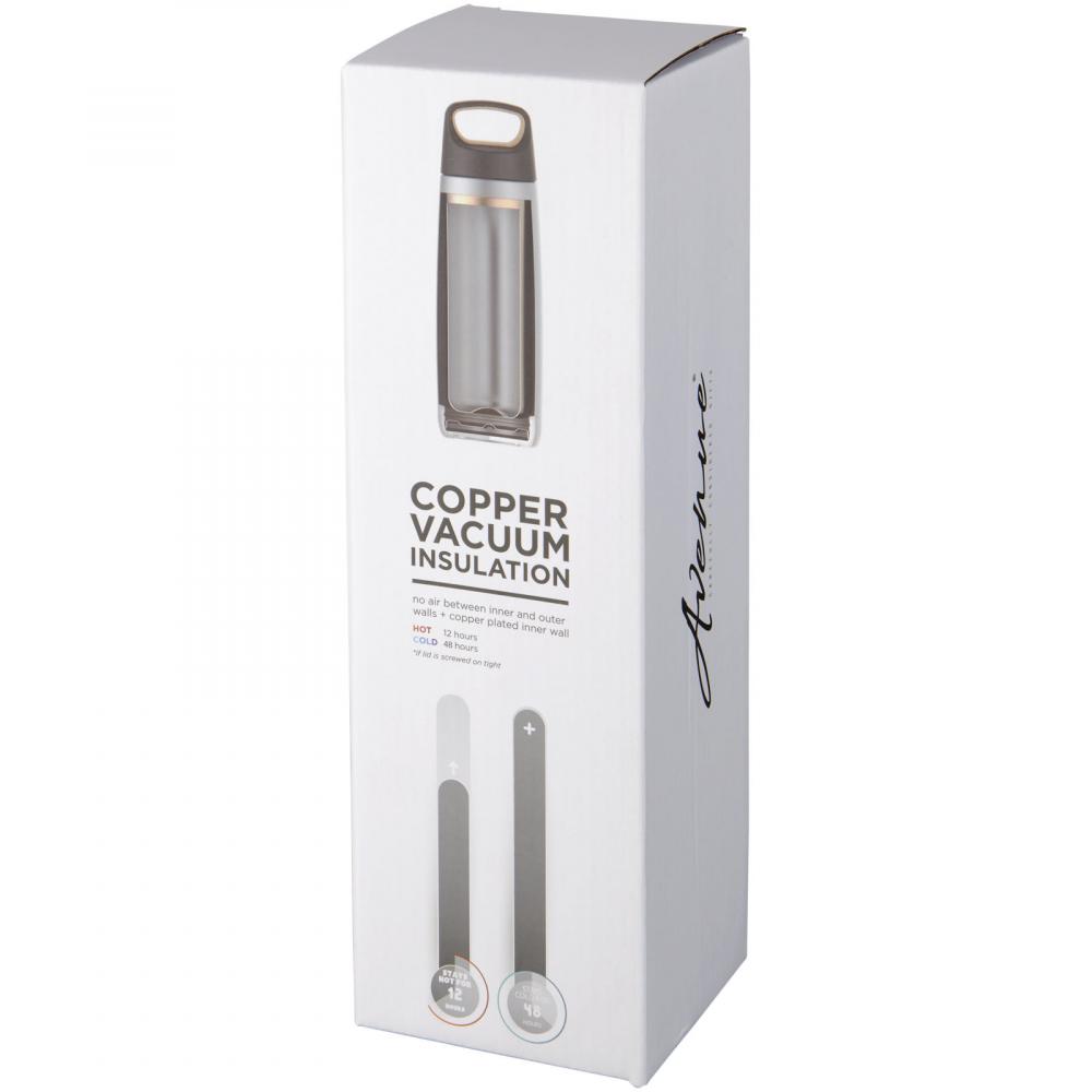 Двустенная вакуумная конструкция из нержавеющей стали с медной изоляцией, которая позволяет напиткам оставаться холодными в течение 48 часов или горячими не менее 12 часов. Конструкция также предотвращает образование конденсата на внешней стороне бутылки. Винтовая крышка с элементами дизайна из пробки и нескользящее дно. Объем 600 мл. Поставляется в подарочной коробке Avenue.