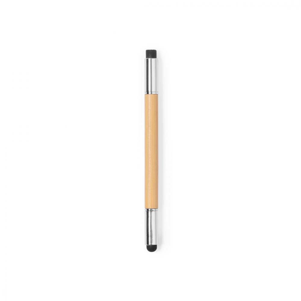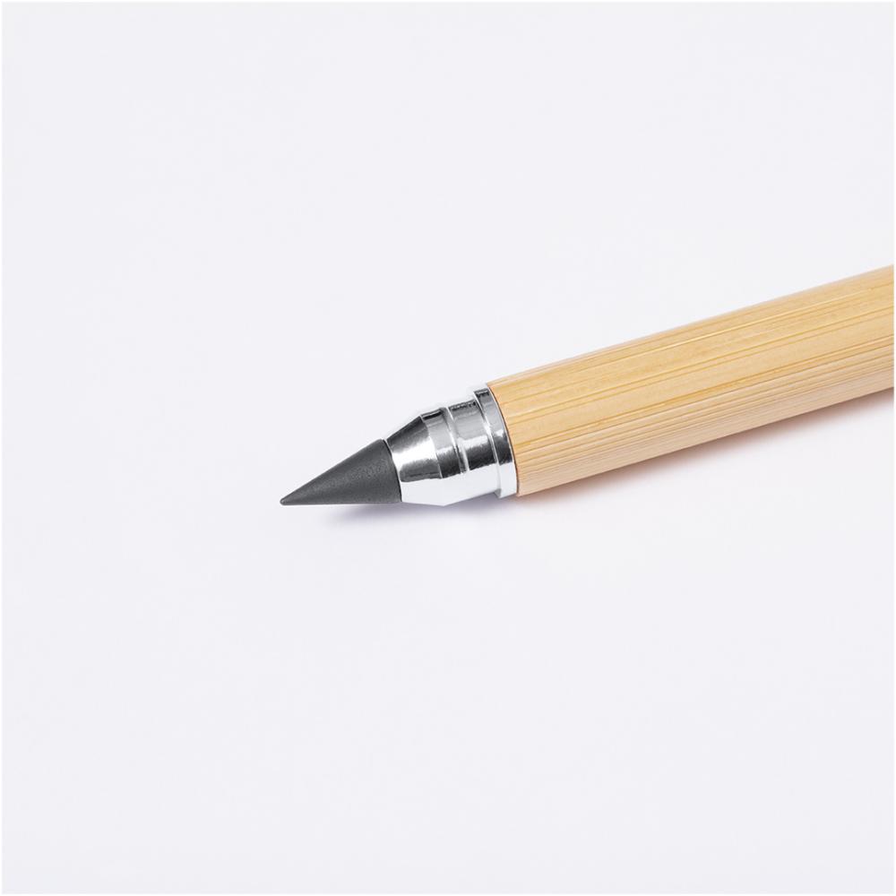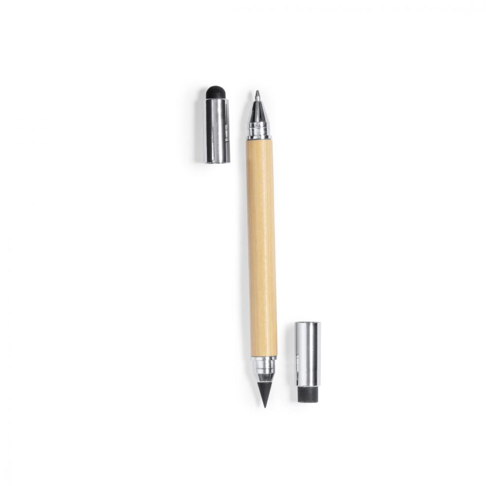 Вечный карандаш и шариковая ручка 2 в 1. Корпус выполнен из бамбука с хромированными деталями. Закрытие колпачками с ластиком и стилусом на обоих концах. Синие чернила. Представлен в хлопковом мешочке с завязкой.