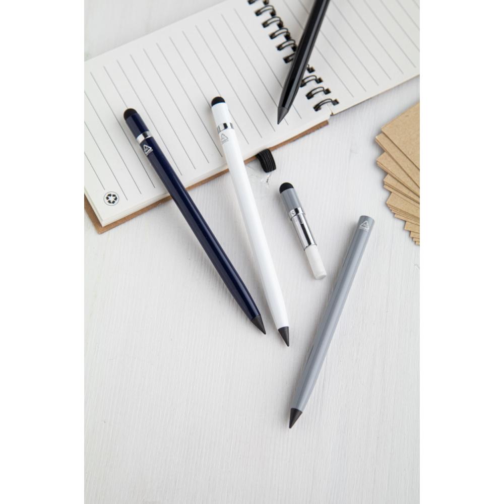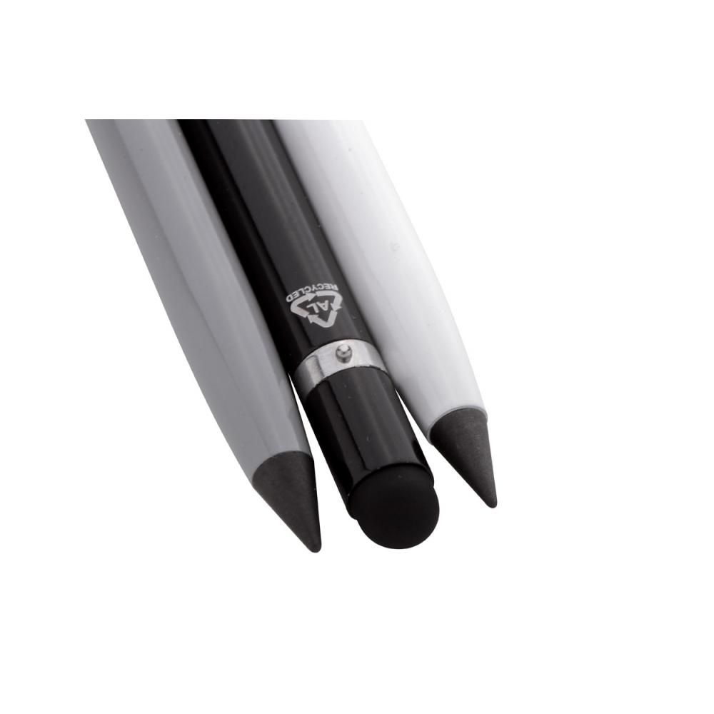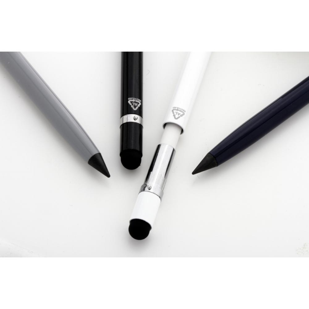 Вечный карандаш из переработанного алюминия со стилусом для сенсорного экрана и наконечником из металлического сплава, который окисляет бумагу. Имеется ластик на внутренней стороне сенсорного стилуса.