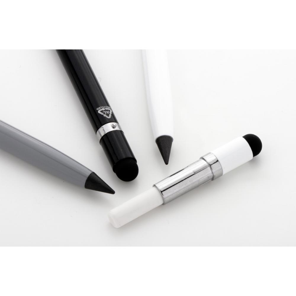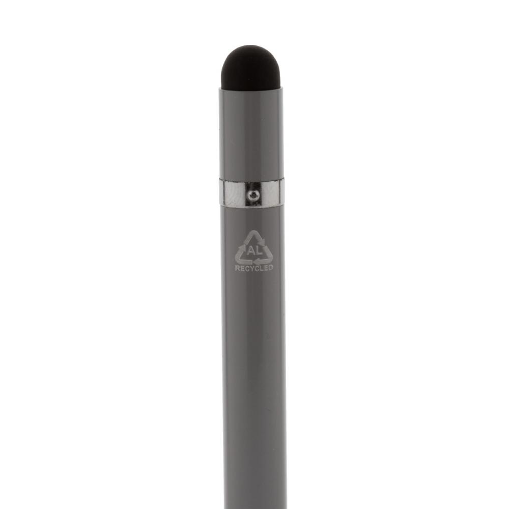 Вечный карандаш из переработанного алюминия со стилусом для сенсорного экрана и наконечником из металлического сплава, который окисляет бумагу. Имеется ластик на внутренней стороне сенсорного стилуса.