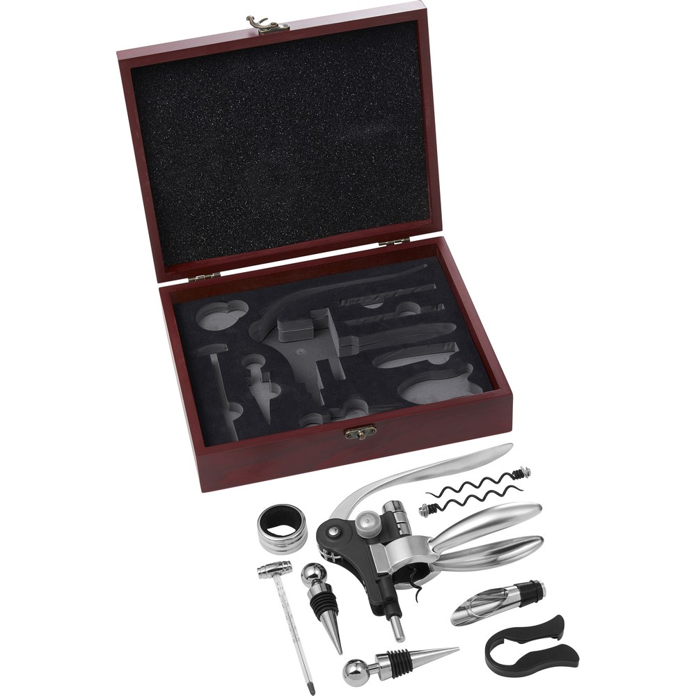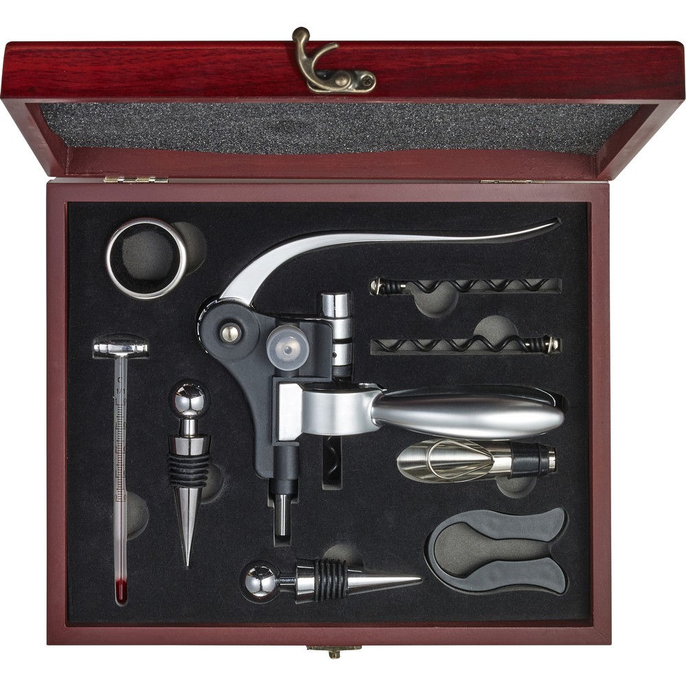 Винный набор 9 шт. В деревянной коробке, в том числе: 2 пробки для бутылок, кольцо, термометр, резак для фольги, воронка и штопор.