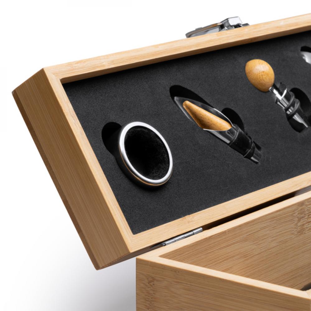 Деревянный футляр для бутылки вина - идеальное дополнение для транспортировки и представления бутылки вина в элегантном стиле. Изготовленный из дерева, этот футляр обеспечивает безопасную защиту и изысканный внешний вид. Футляр имеет особый дизайн, который включает набор для вина, представленный на крышке. Этот набор состоит из нержавеющих стальных аксессуаров, таких как штопор с открывалкой для капсулы, дозатор, пробка и кольцо для капель. Эти элементы предоставляют все необходимые инструменты для открытия и наслаждения бутылкой вина с легкостью. Внутренняя часть футляра обита для обеспечения безопасности и стабильности бутылки во время транспортировки. Кроме того, дерево, используемое при изготовлении, обеспечивает дополнительную защиту от ударов и изменений температуры. Это представление также делает его идеальным подарком для любителей вина и винных впечатлений.