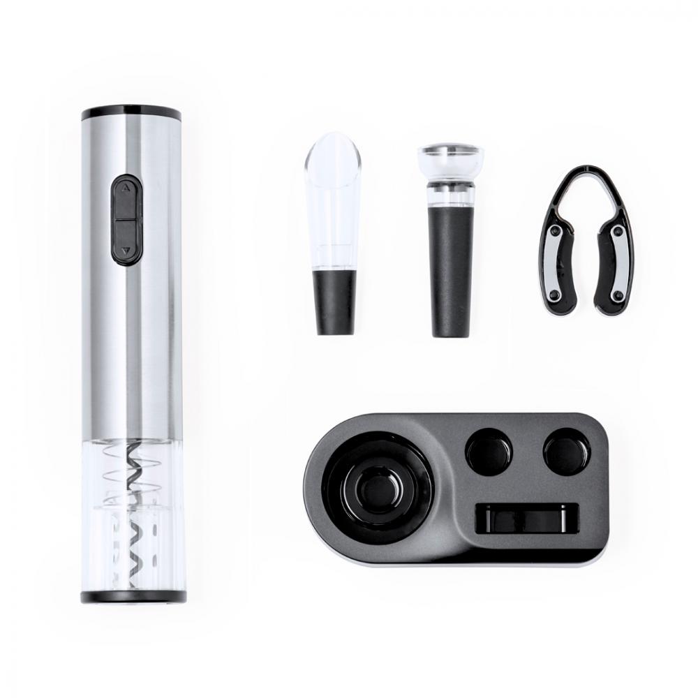 Удобный винный набор с 4 аксессуарами. Включает в себя электрический штопор, работающий от 4 батареек типа AAA (не включены), декантер, крышку и открывалку для капсул с механизмом нажатия. В комплекте элегантная черная подставка для аксессуаров. Представлен в коробке дизайна "крафт".