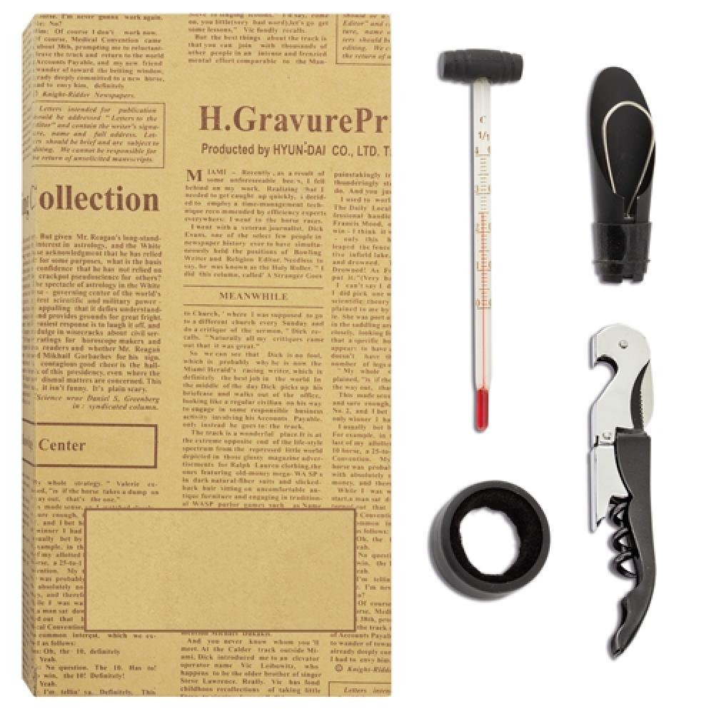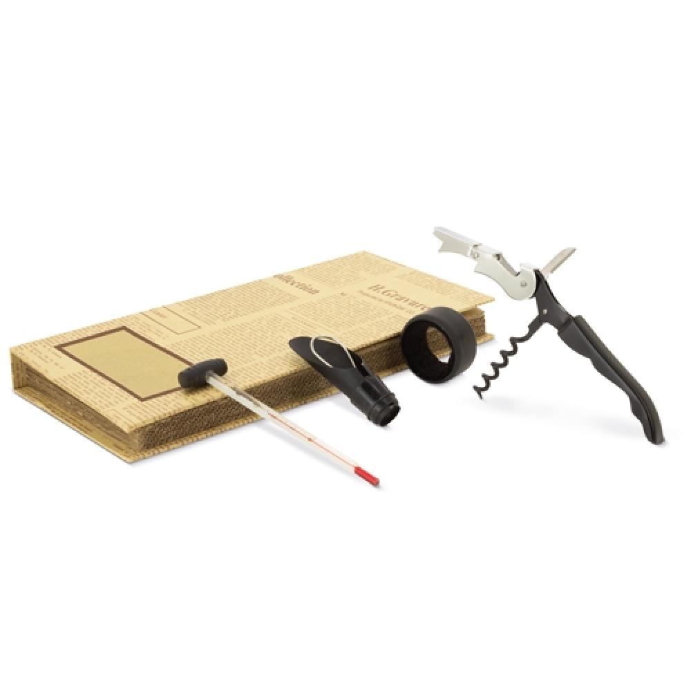 Набор, включающий антикапельное кольцо, дозатор, пробку с штопором и термометр.