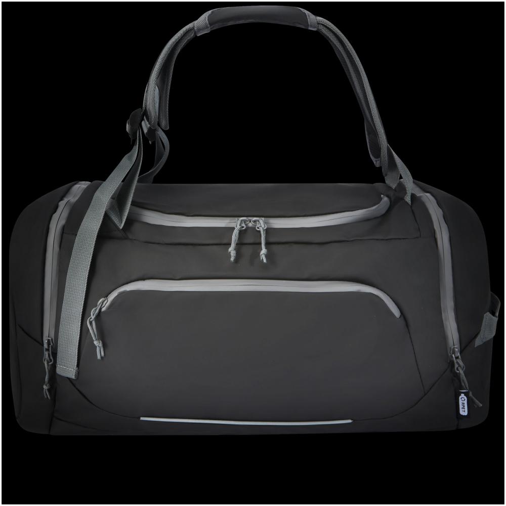 Водонепроницаемая сумка-рюкзак 2-в-1, изготовленная из сертифицированных по GRS переработанных материалов, включая молнии. Она имеет просторное основное отделение с U-образным открытием для легкого хранения и доступа, два боковых кармана на молнии (включая отделение для обуви), один передний карман на молнии, сетчатый карман для воды на спине и светоотражающую окантовку для видимости. Эту сумку можно носить тремя разными способами: в руке, на плече или как рюкзак с мягкими и регулируемыми лямками. Переработанные материалы GRS включают основную ткань, подкладку, ленты и молнии. Вместимость: 35 литров. Не содержит ПВХ.