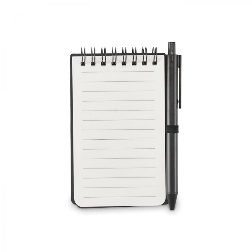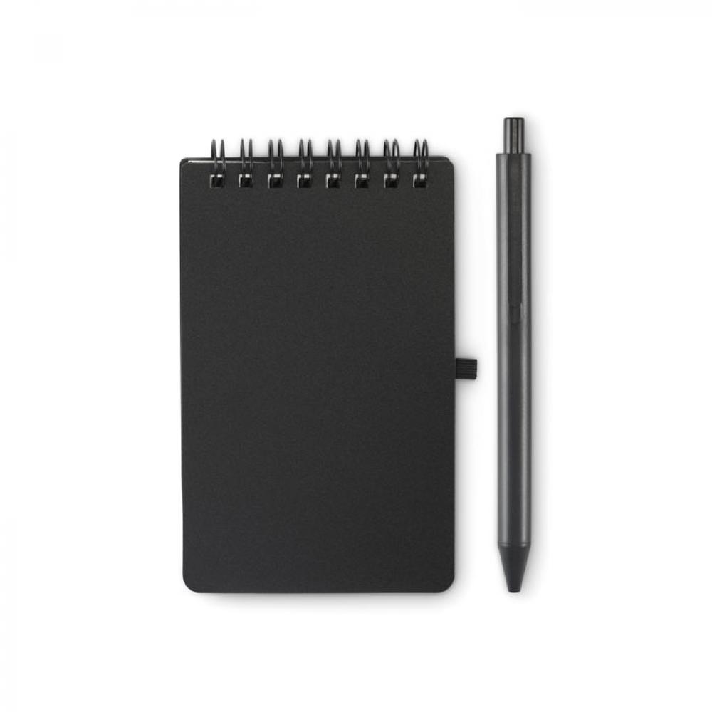 Водонепроницаемый блокнот в обложке из полипропилена с ручкой. Двойная спираль. Минеральная бумага плотностью 120 г/м², 50 линованных листов. Синяя чернила. Эластичная застежка и держатель для ручки.