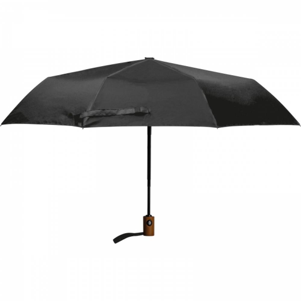 Автоматический карманный зонт с каркасом из стекловолокна, чехол из переработанных ПЭТ-бутылок, деревянная ручка и ремешок для запястья.