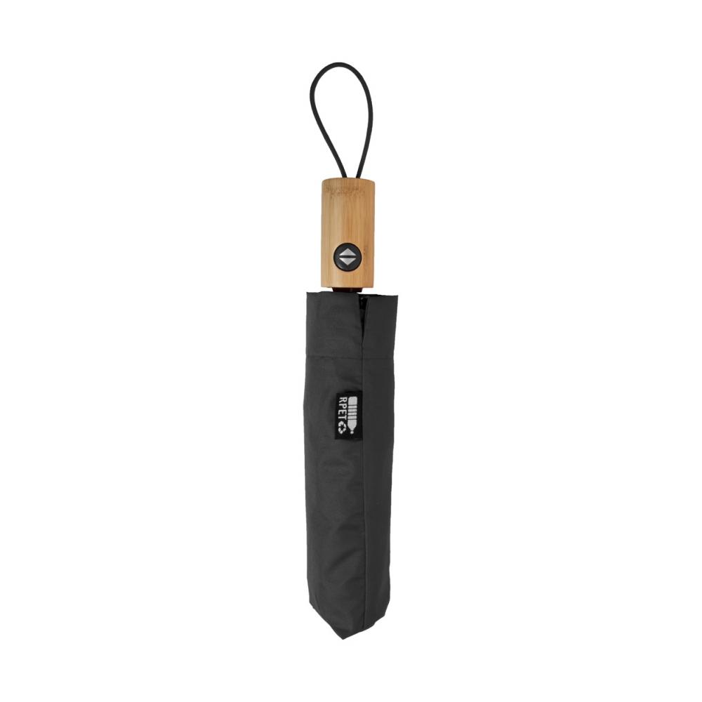 Полностью автоматический (открывание/закрывание), ветрозащитный складной зонт с 8 панелями в сумке соответствующего цвета. С металлической рамой, стекловолоконными ребрами и ручкой из бамбука. 190T RPET понж. С характерной этикеткой RPET.