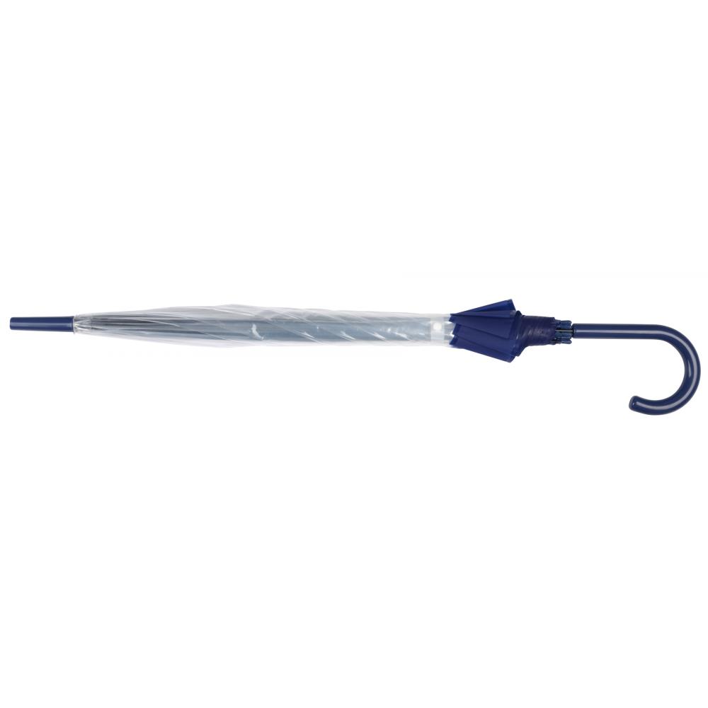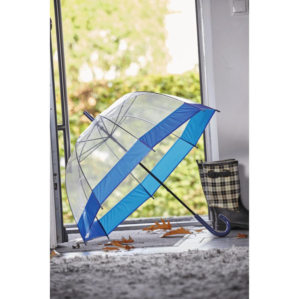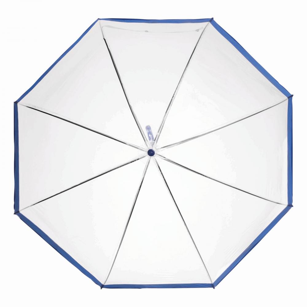 Зонт куполообразной формы HONEYMOON: металлический стержень и нервюры, пластиковые наконечники и верх, пластиковая изогнутая ручка, прозрачный навес из POE с цветной каймой, закрытие с помощью кнопки