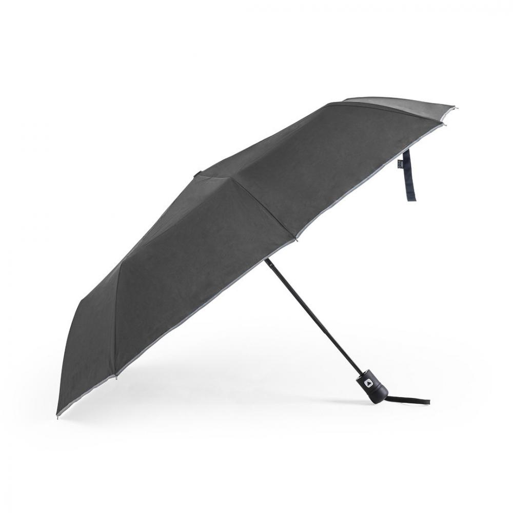 Складной зонт диаметром 100 см. В 190T RPET pongee материал, изготовленный из переработанного пластика.Со светоотражающей лентой по всему периметру зонта. Автоматическое открывание, с ветрозащитным механизмом и ребрами жесткости из стекловолокна. Ручка с кнопкой и эмблемой RPET на этикетке. С соответствующим чехлом RPET.