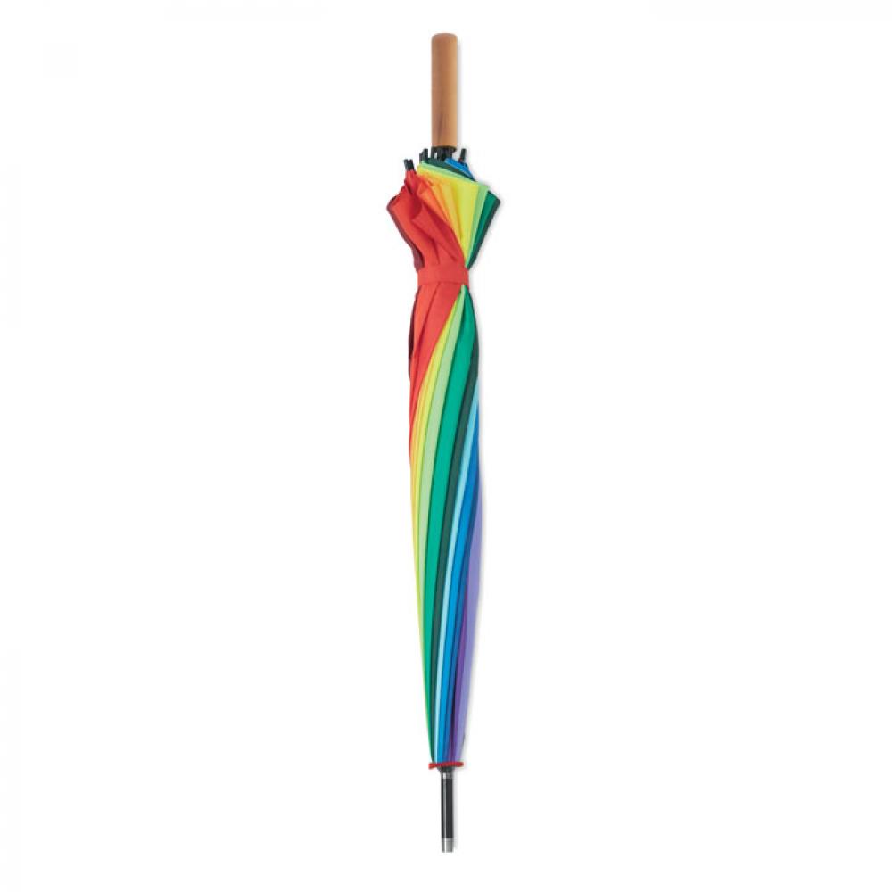 Автоматический 27-дюймовый зонт радужной окраски. Материал эпонж 190T. Деревянный стержень, спицы из стекловолокна, металлические наконечники. 16 панели.