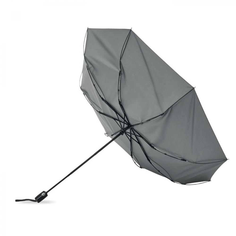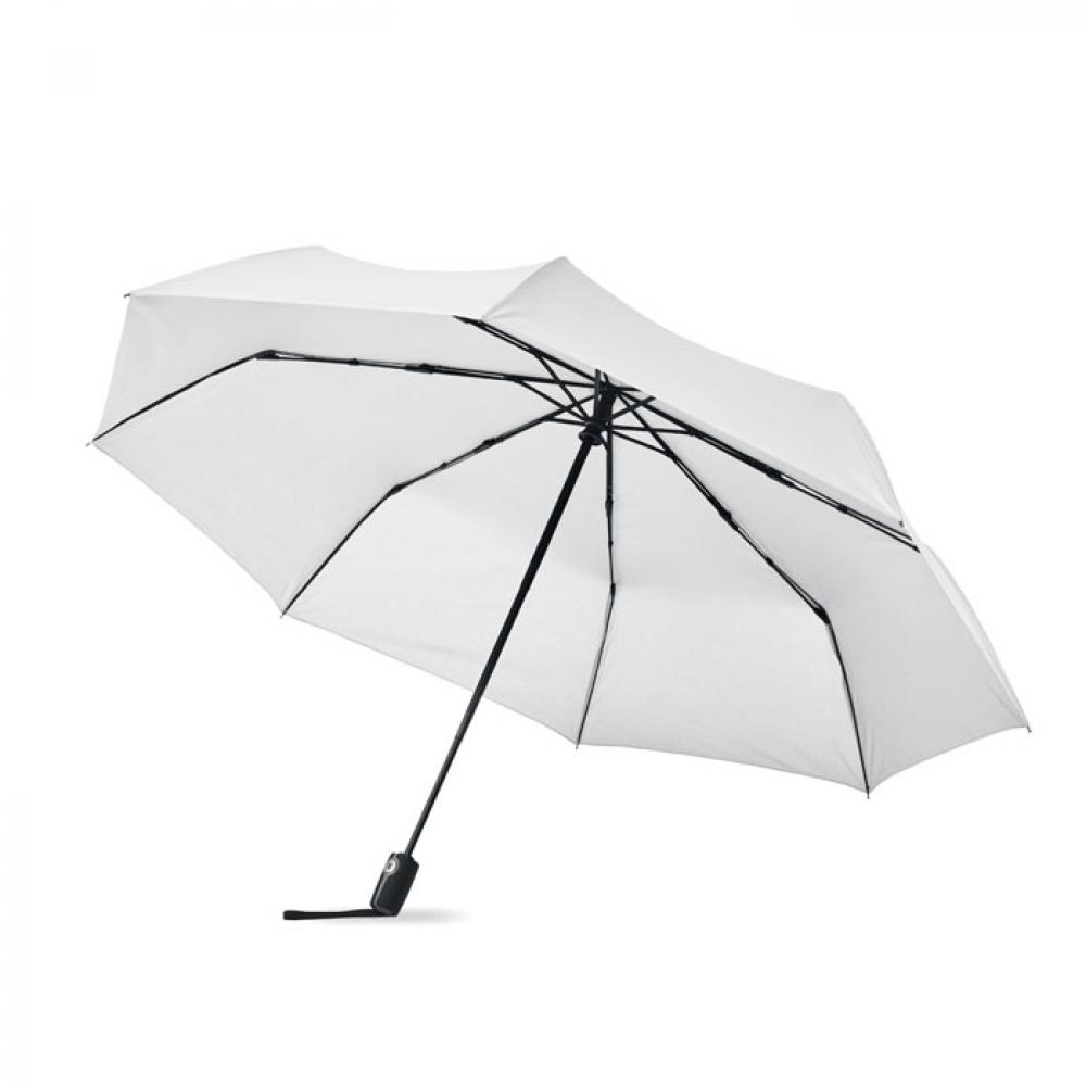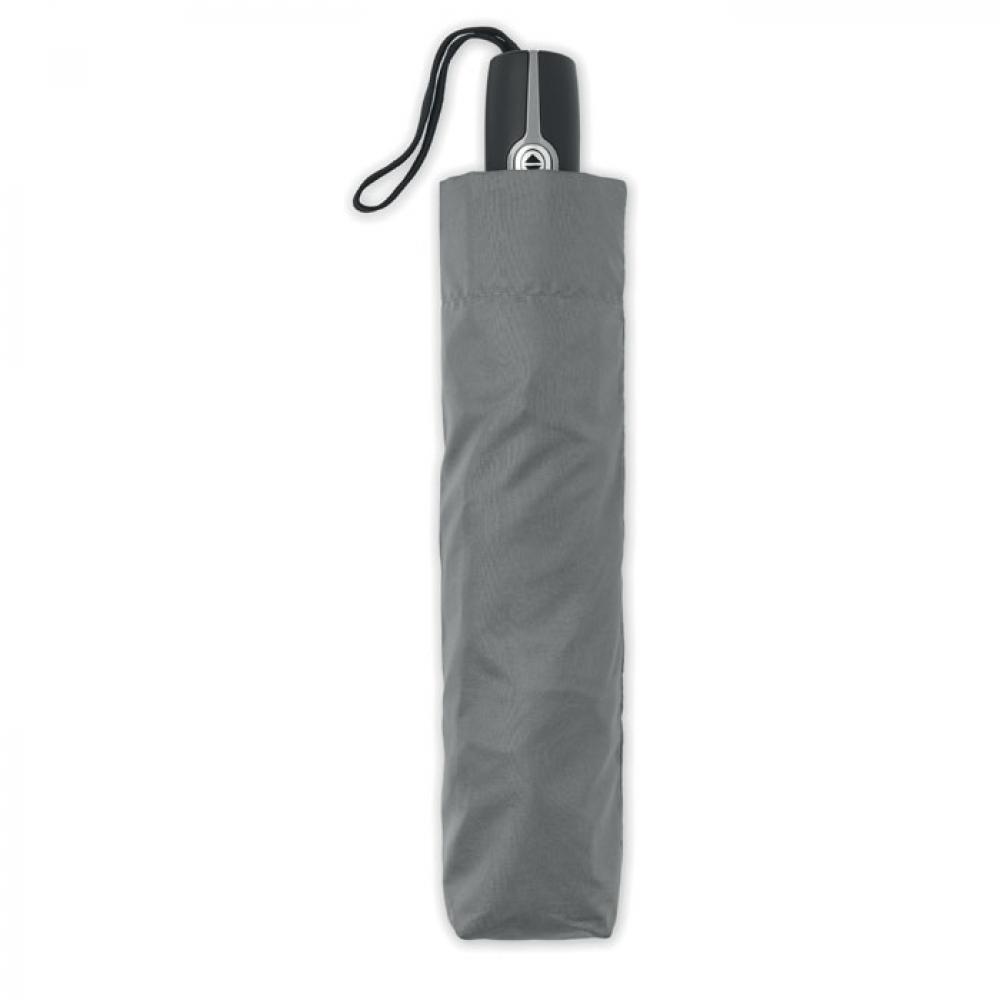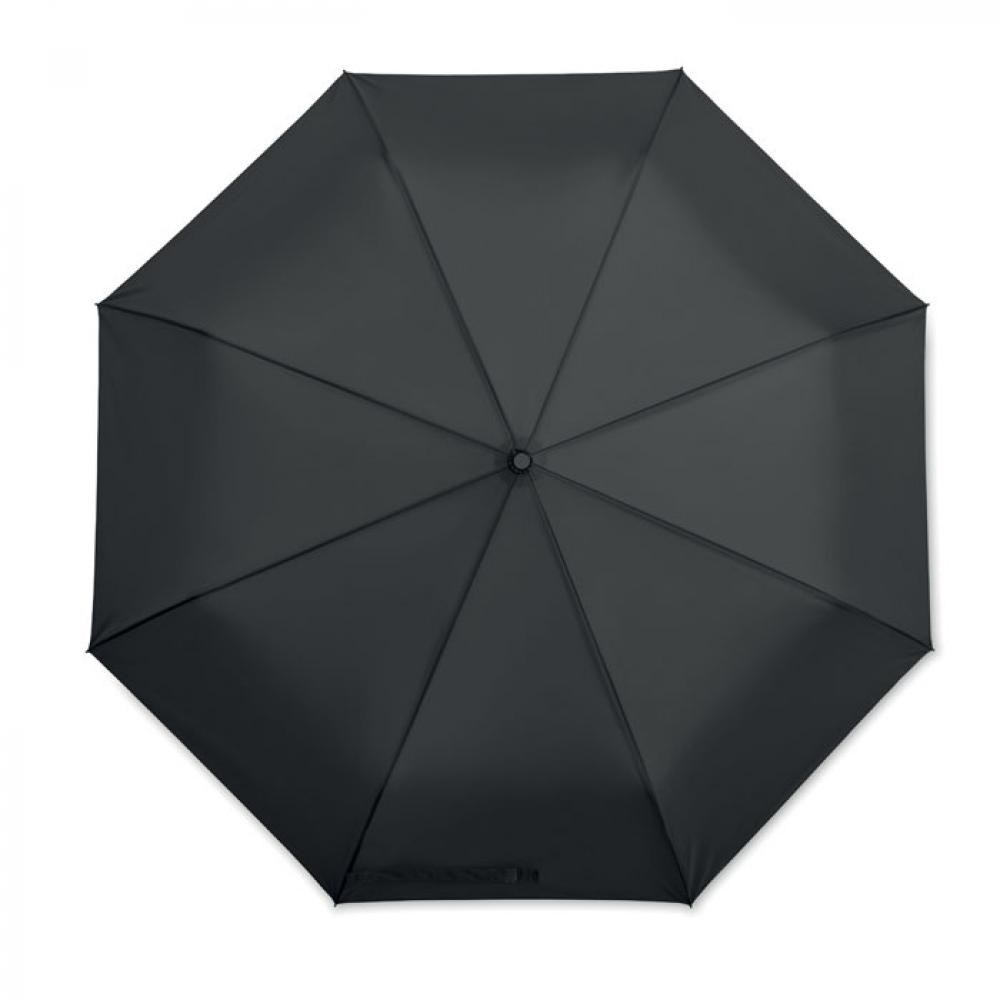 27-дюймовый ветроустойчивый зонт автомат в 3 сложения. Материал 190T эпонж, стальной стержень с черным покрытием. Спицы из стекловолокна. Черная полипропиленовая ручка с кнопкой. В комплекте с чехлом.