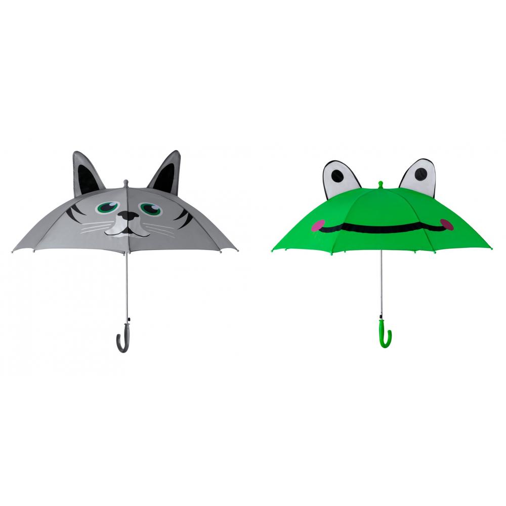 Детский зонт с веселыми дизайнами кота и лягушки. Диаметр 78 см, изготовлен из прочного полиэстерового материала 180T. Автоматическое открывание, с металлическим каркасом и спицами, изогнутой ручкой и соответствующим полиэстеровым чехлом. 18". Автоматический. Полиэстеровая сумка