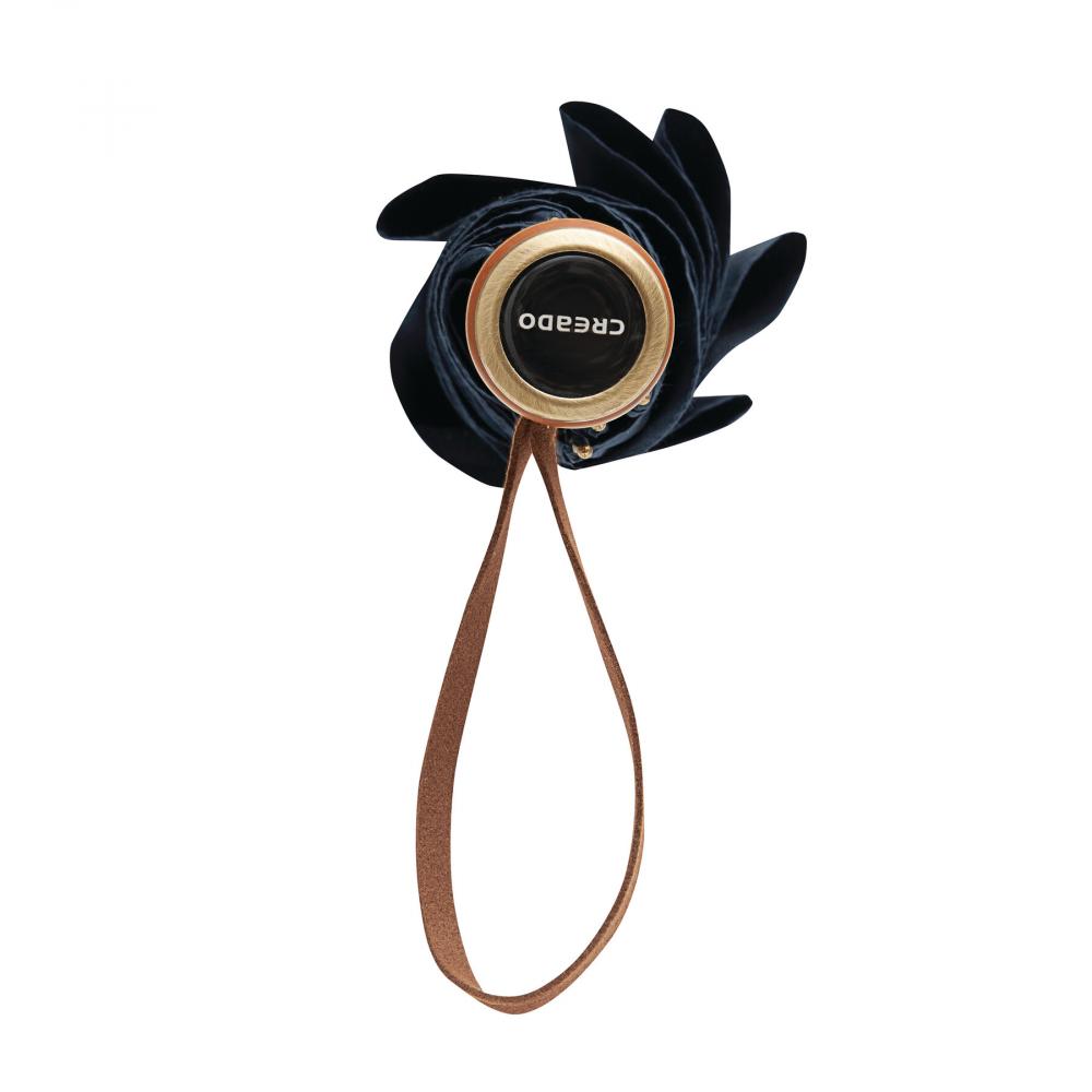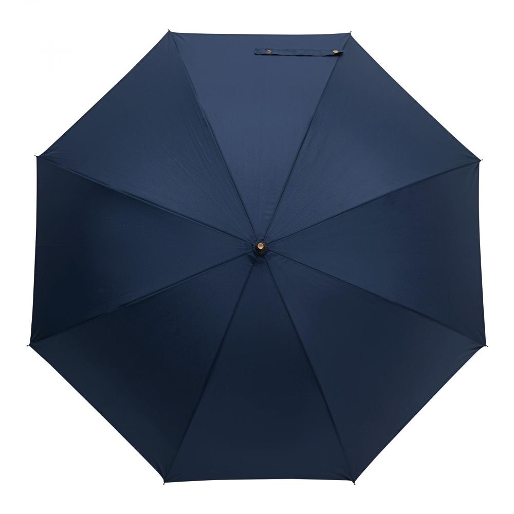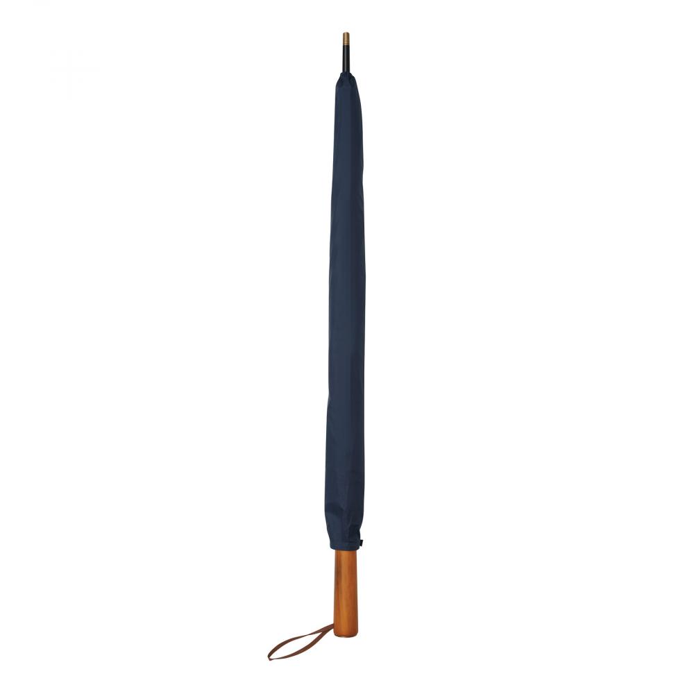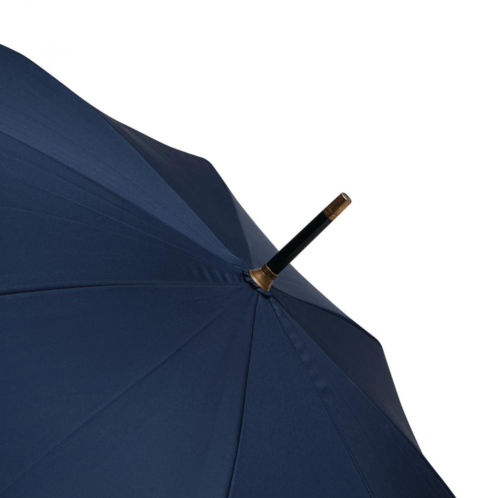 Зонт-трость Automatic POLKA: с черным металлическим стержнем, стекловолоконными спицами, металлическими наконечниками, прямой деревянной ручкой с автоматической кнопкой выпуска латунного цвета и с домингом 'CREADO' на ручке, премиальный полиэстеровый понжевый купол и чехол, ремешок для закрытия с кнопкой
