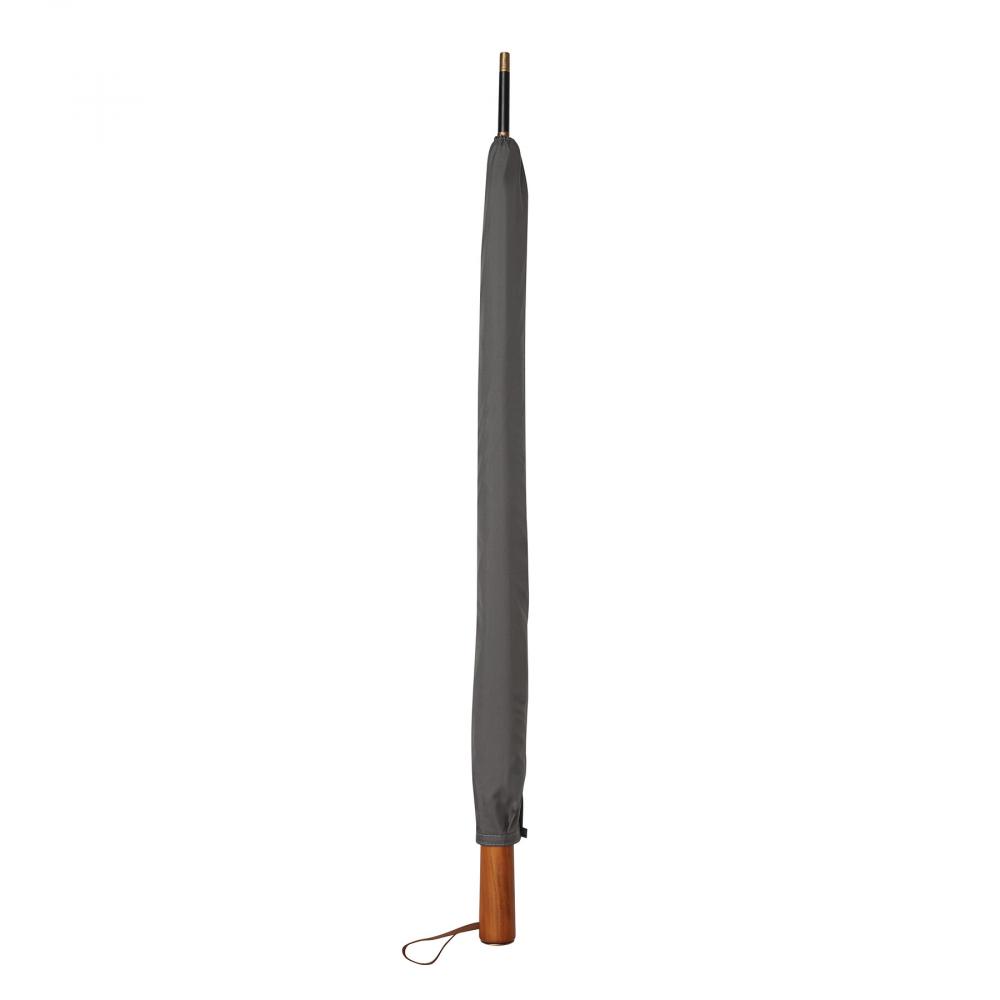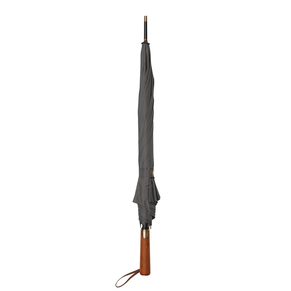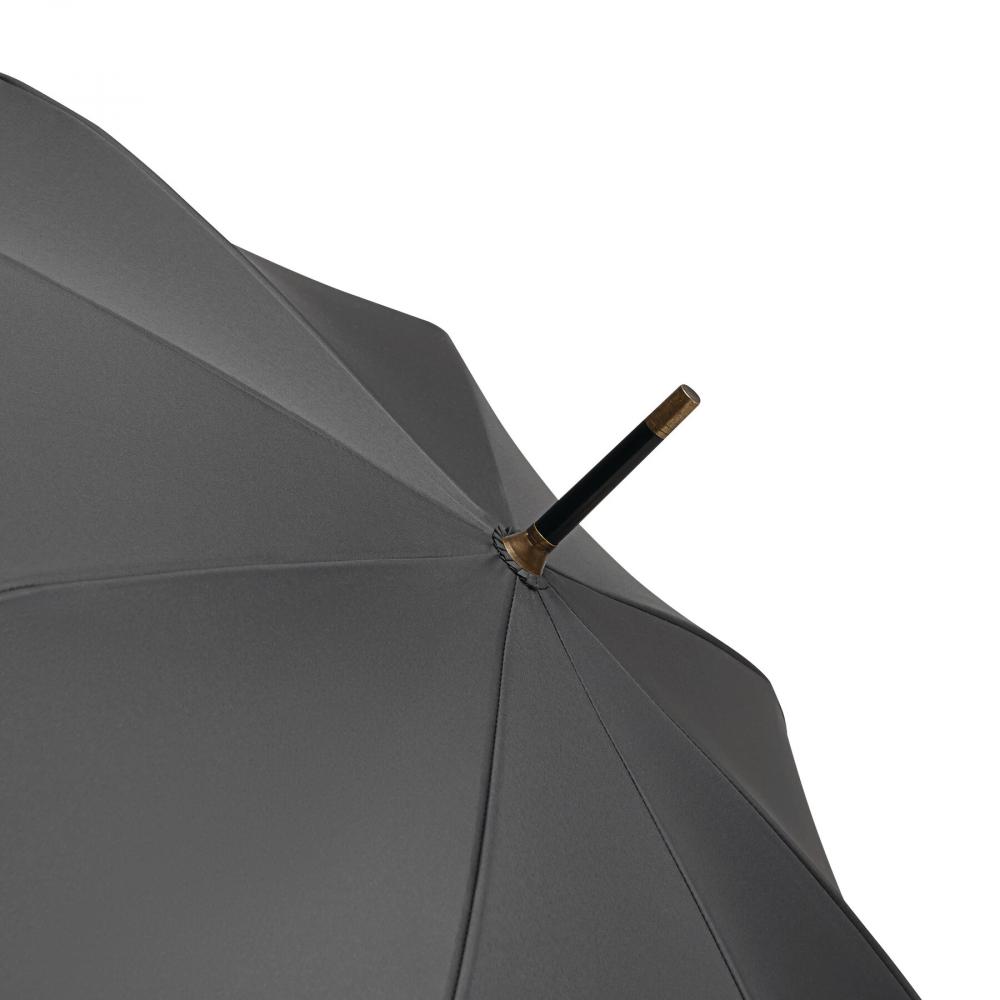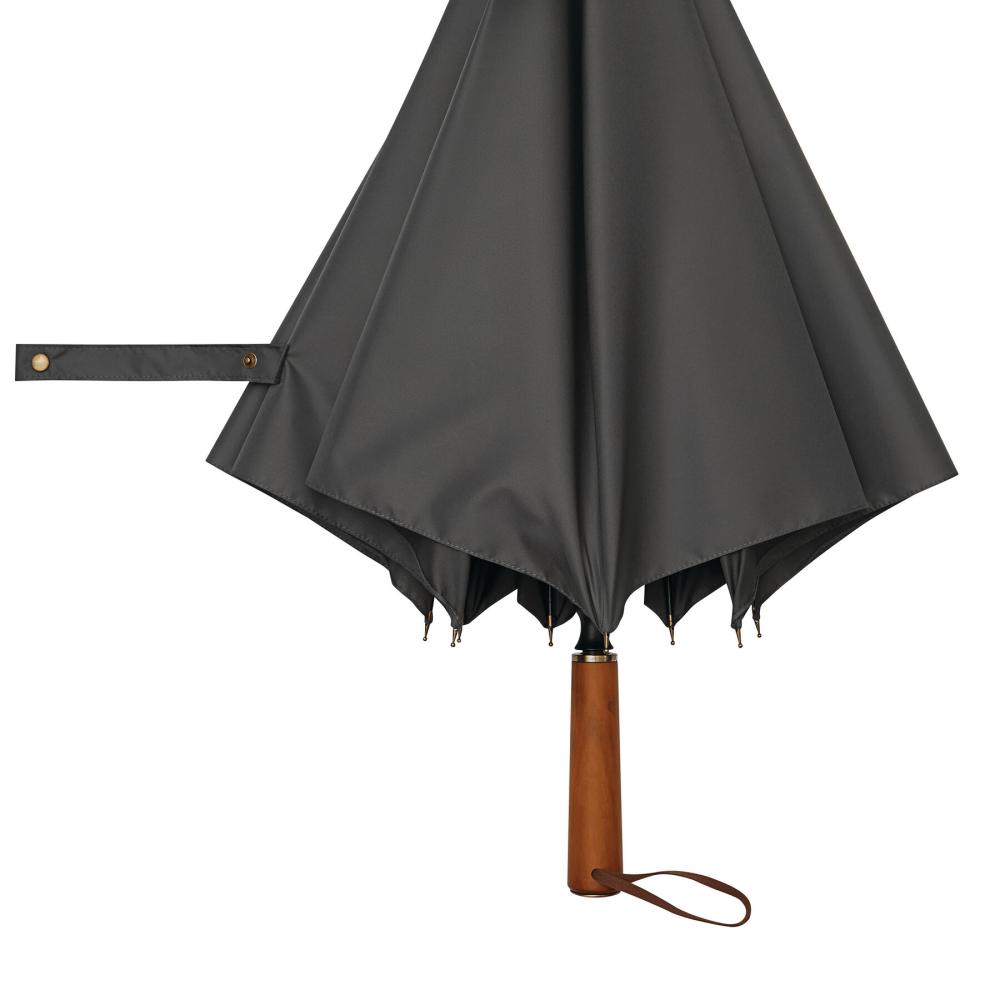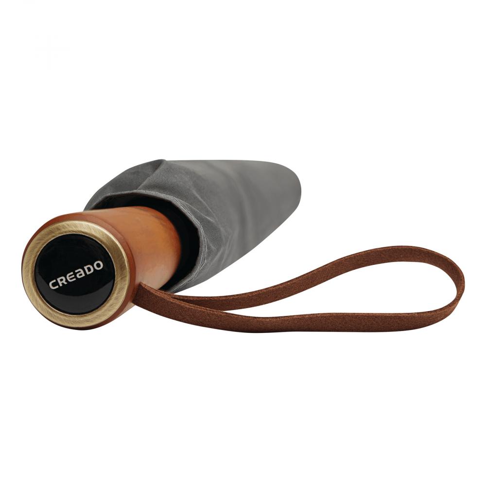Зонт-трость Automatic POLKA: с черным металлическим стержнем, стекловолоконными спицами, металлическими наконечниками, прямой деревянной ручкой с автоматической кнопкой выпуска латунного цвета и с домингом 'CREADO' на ручке, премиальный полиэстеровый понжевый купол и чехол, ремешок для закрытия с кнопкой