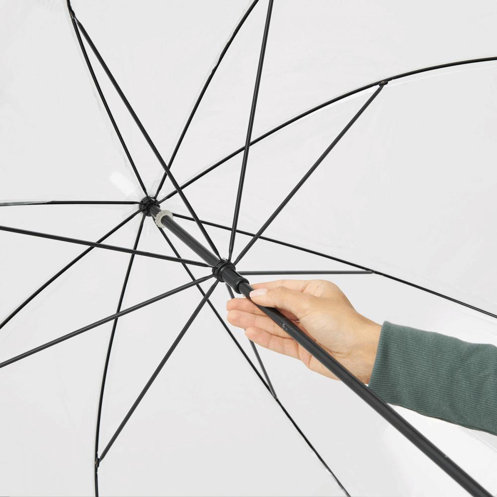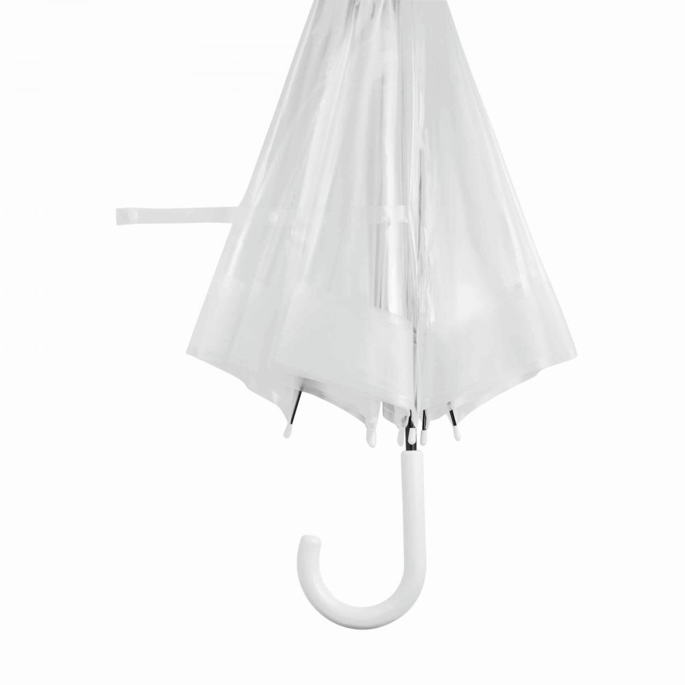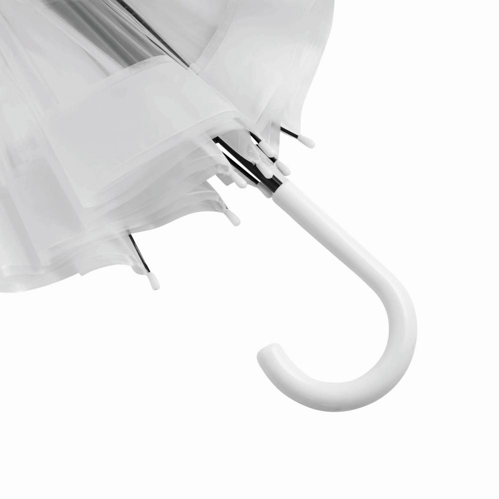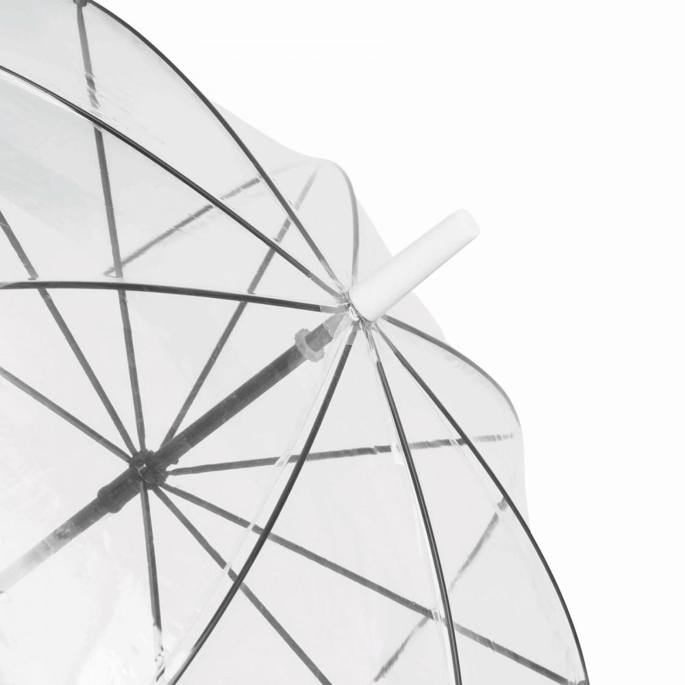 Зонт куполообразной формы HONEYMOON: металлический стержень и нервюры, пластиковые наконечники и верх, пластиковая изогнутая ручка, прозрачный навес из POE с цветной каймой, закрытие с помощью кнопки