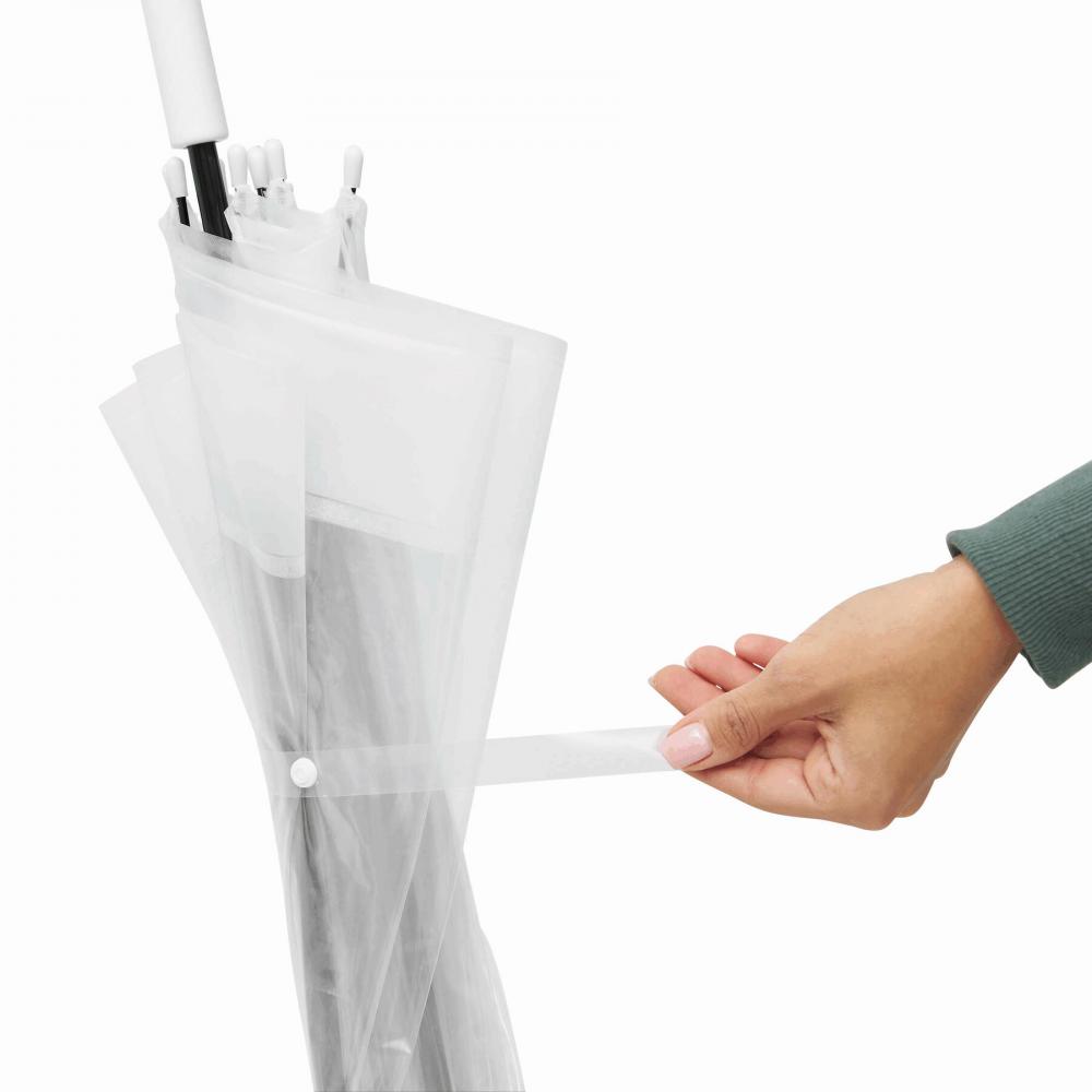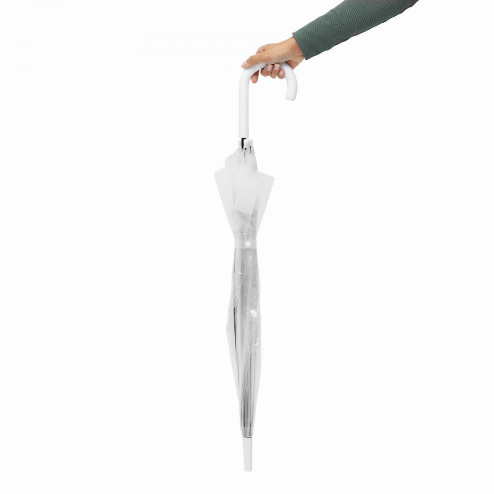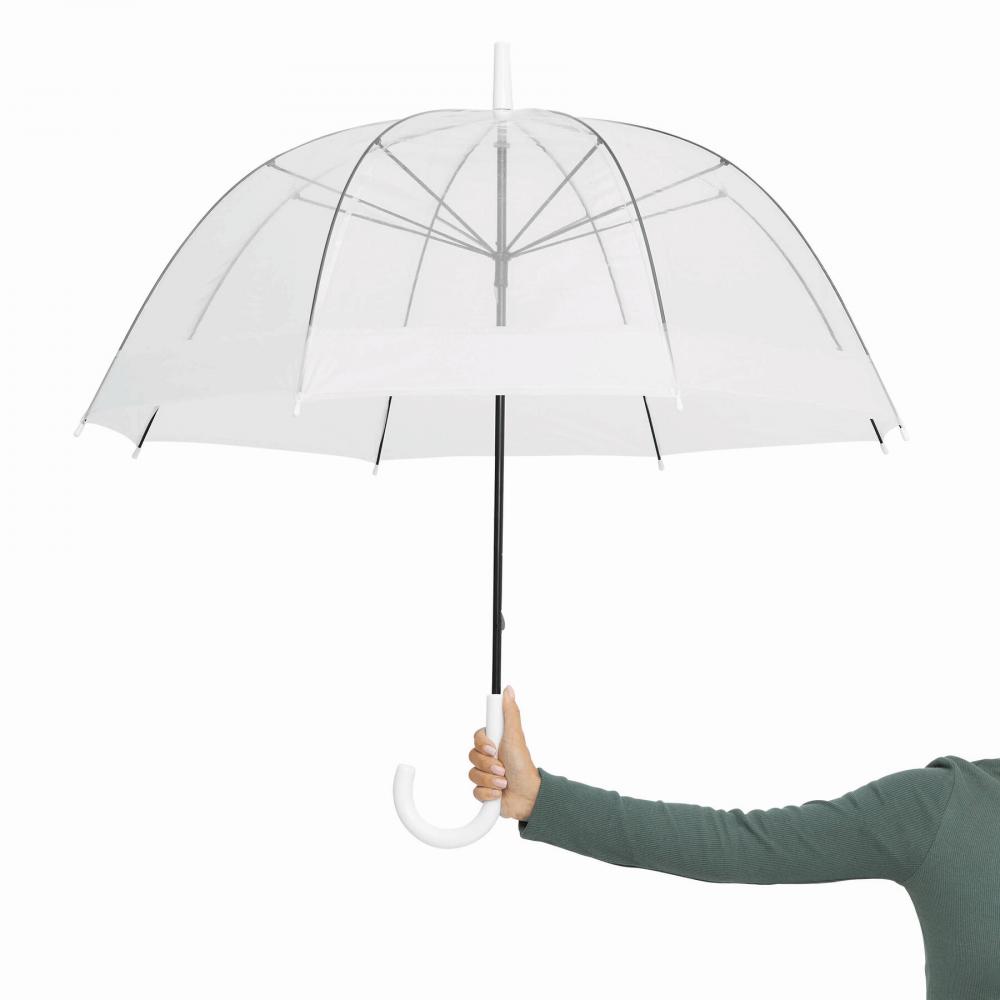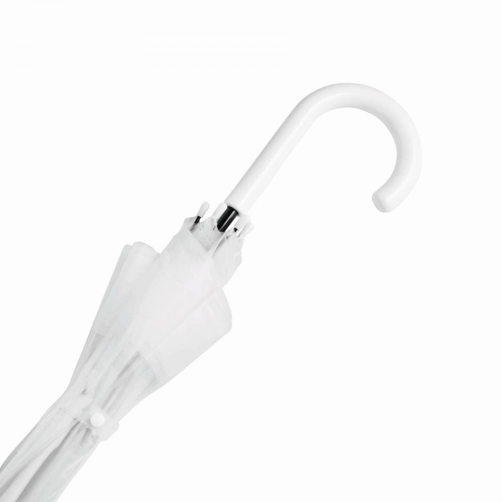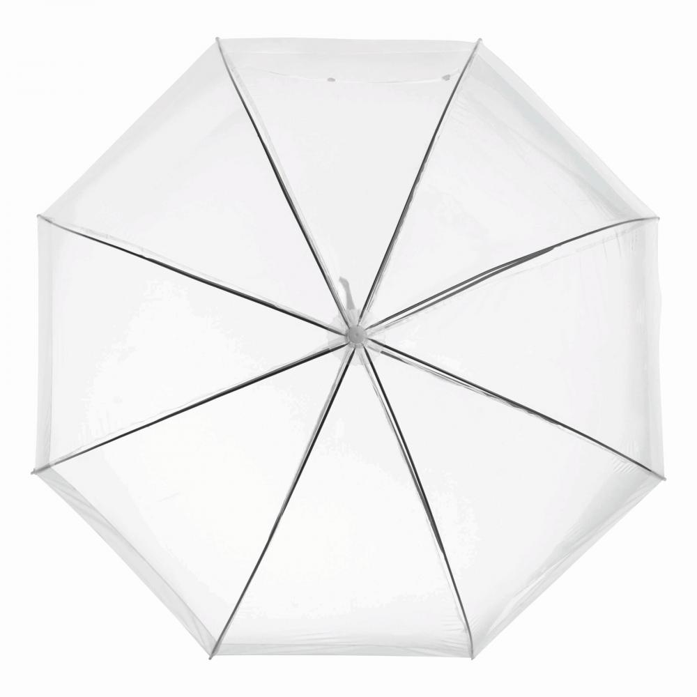 Зонт куполообразной формы HONEYMOON: металлический стержень и нервюры, пластиковые наконечники и верх, пластиковая изогнутая ручка, прозрачный навес из POE с цветной каймой, закрытие с помощью кнопки